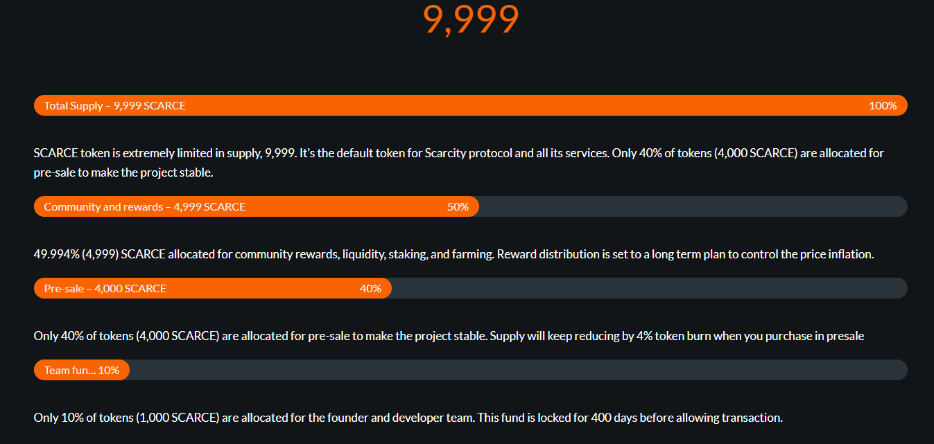 49.994% (4,999) SCARCE distributed for network rewards, liquidity, marking, and cultivating. Prize circulation is set to a drawn-out arrangement to control the cost swelling. Just 40% of tokens (4,000 SCARCE). Just 10% of tokens (1,000 SCARCE) are for the colleagues.