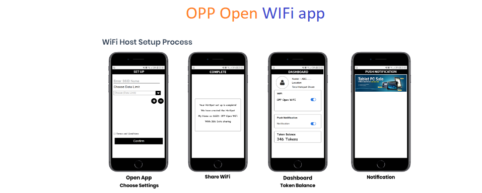 Our app will activate the mobile hotspot function on your smart device and “OPP OPEN WIFI” will be seen by guest Users wishing to access the web. The system is totally secure for both the Hotspot Host and the guest user. The system is designed to work with home and business WiFi too.