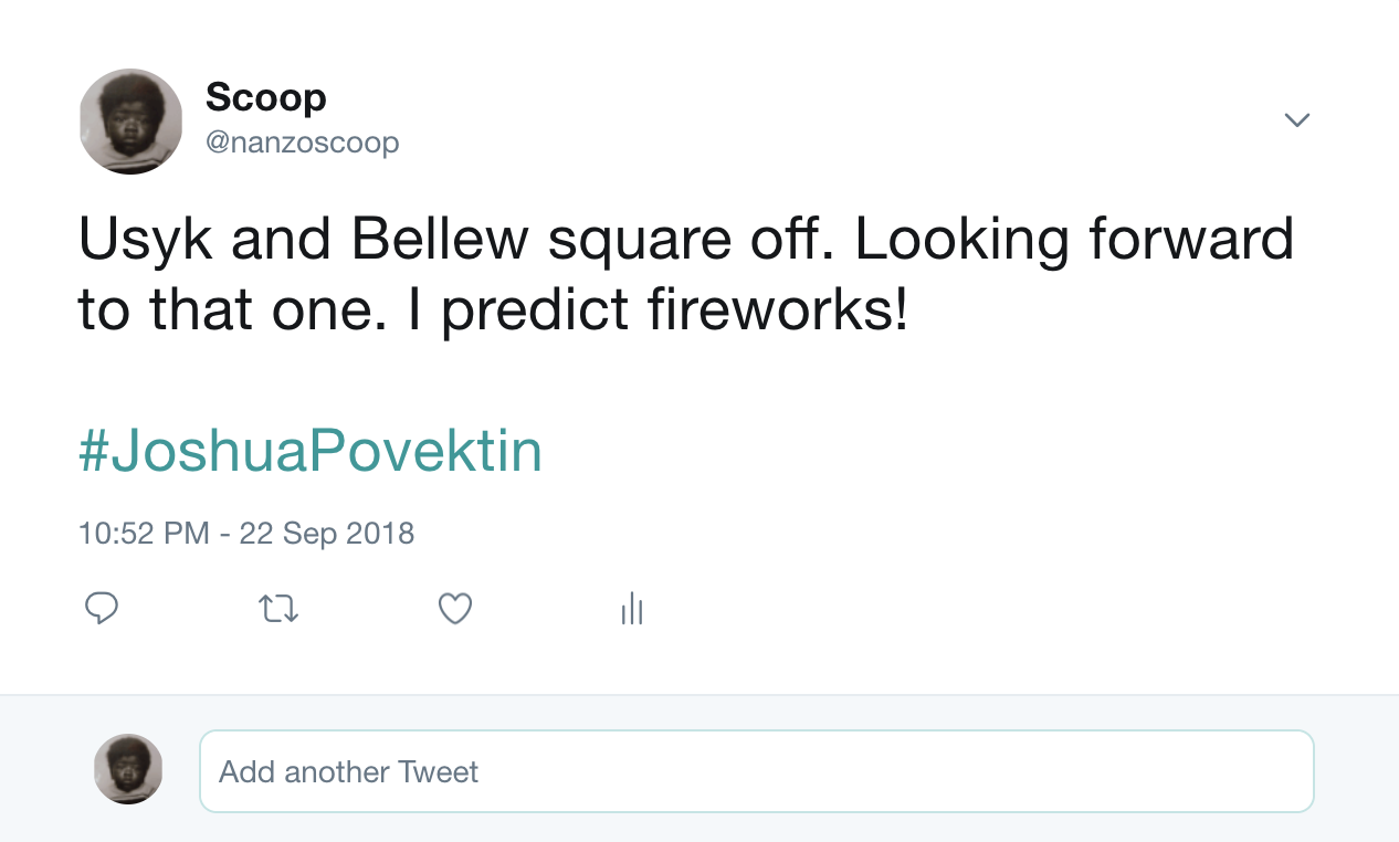 Before the main event, Usyk and Bellew square off. Looking forward to that one. I predict fireworks!