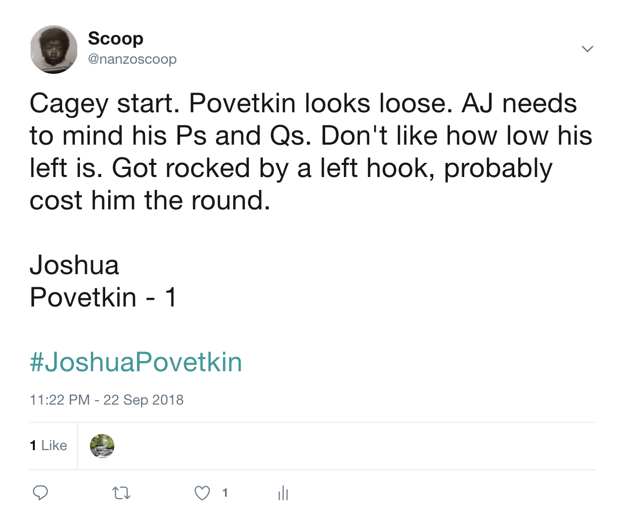 Cagey start. Povetkin looks loose. AJ needs to mind his Ps and Qs. Don't like how low his left is. Got rocked by a left hook, probably cost him the round.