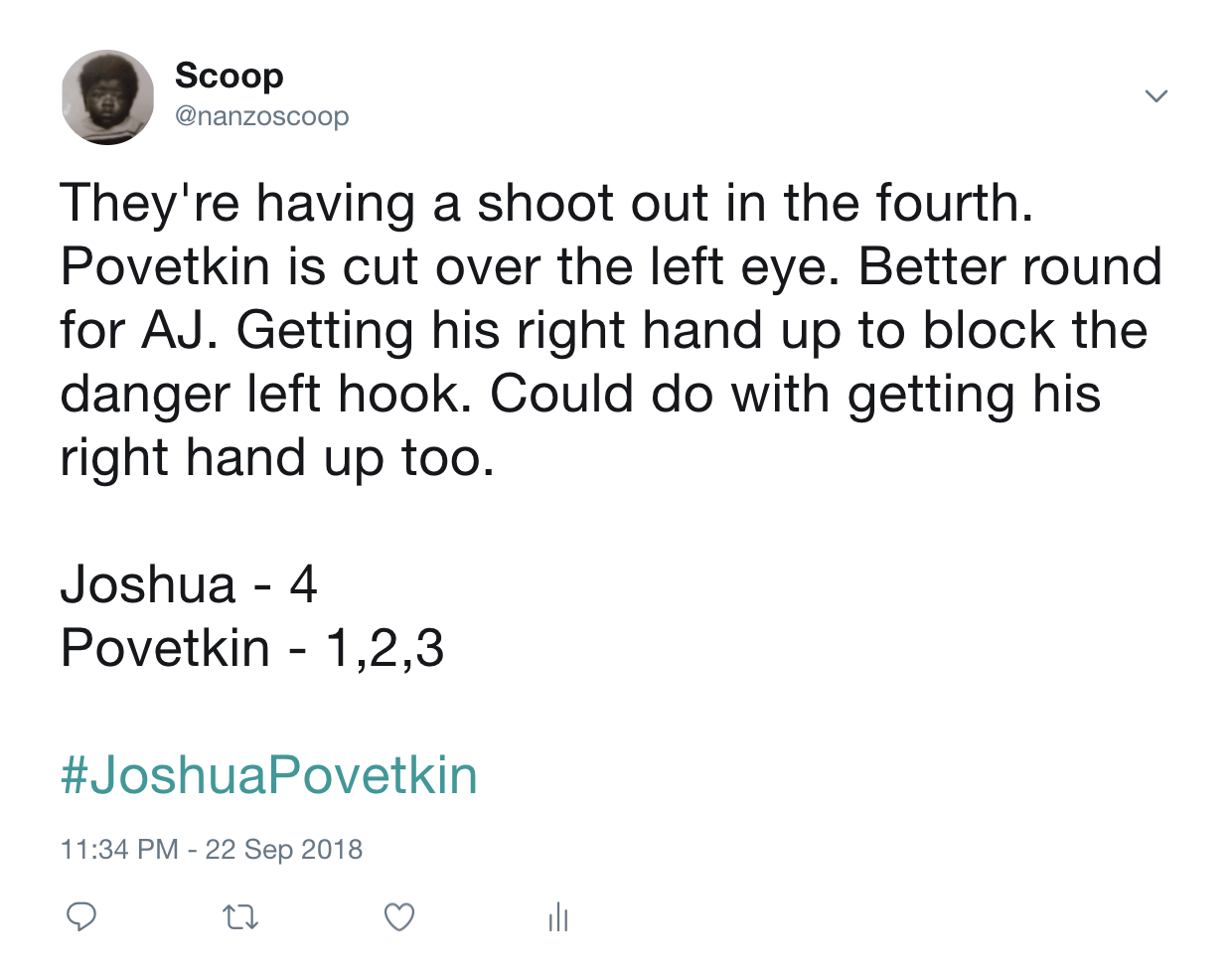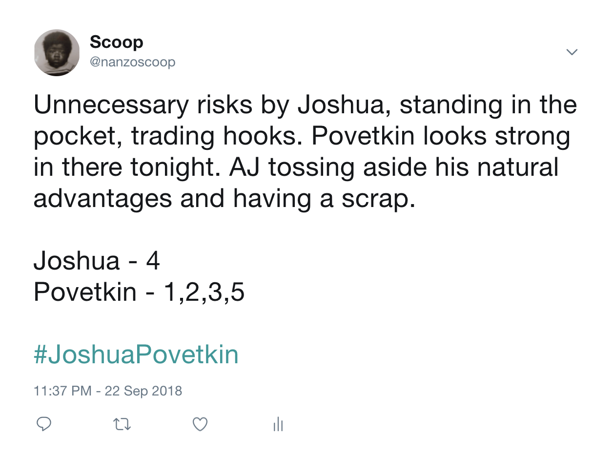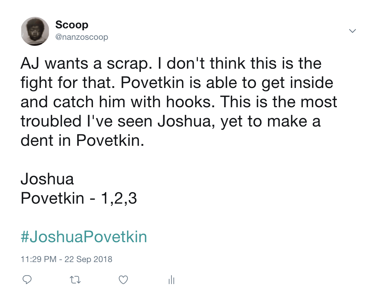 Unnecessary risks by Joshua, standing in the pocket, trading hooks. Povetkin looks strong in there tonight. AJ tossing aside his natural advantages and having a scrap.