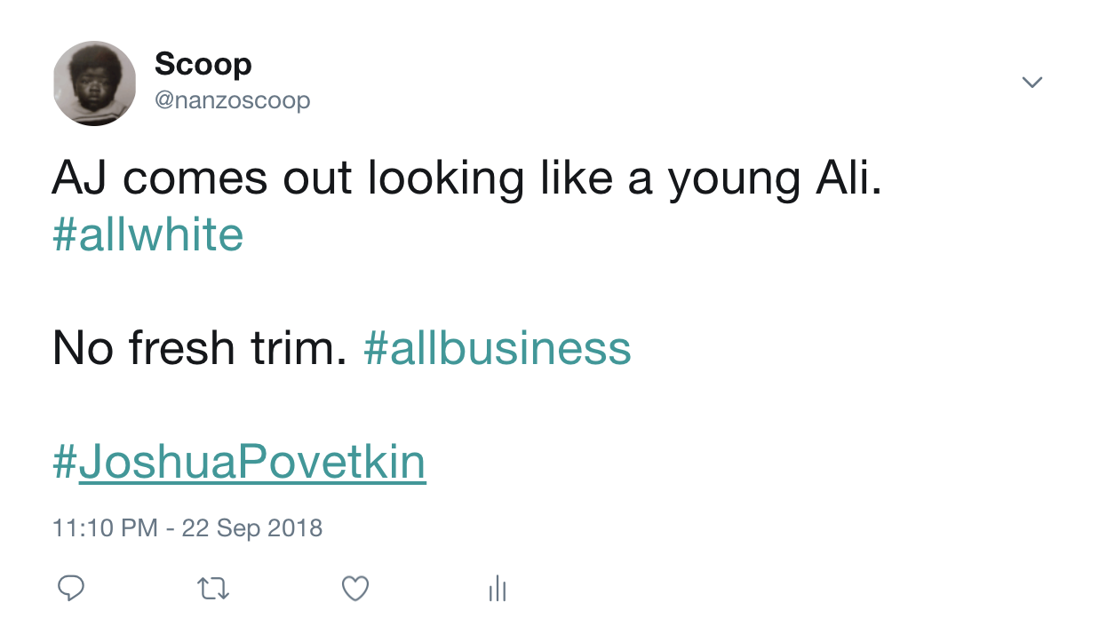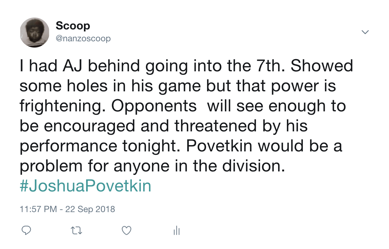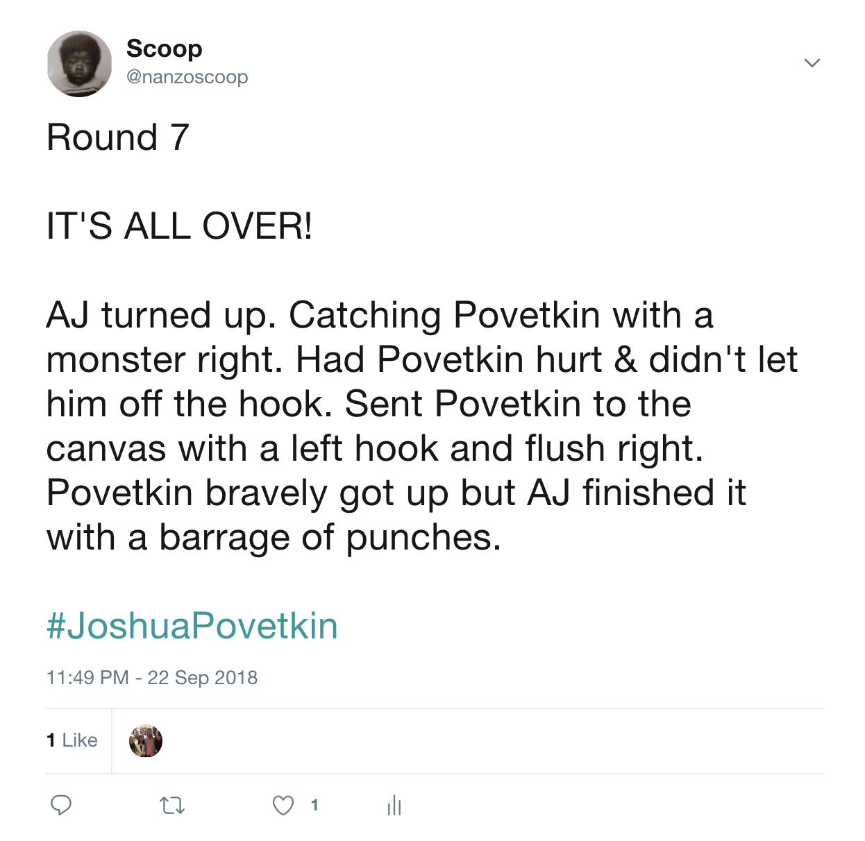 AJ turned up in round 7. Catching Povetkin with a monster right hand. Had Povetkin hurt and didn't let him off the hook. Sent Povetkin to the canvas with a left hook and flush right. Povetkin bravely got up but AJ finished it with a barrage of punches.