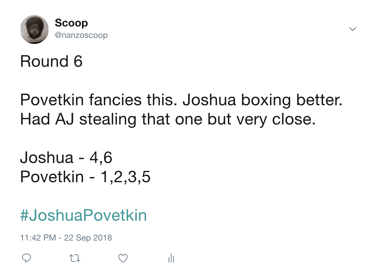 Povetkin fancies this. Joshua boxing better. Had AJ stealing that one but very close.