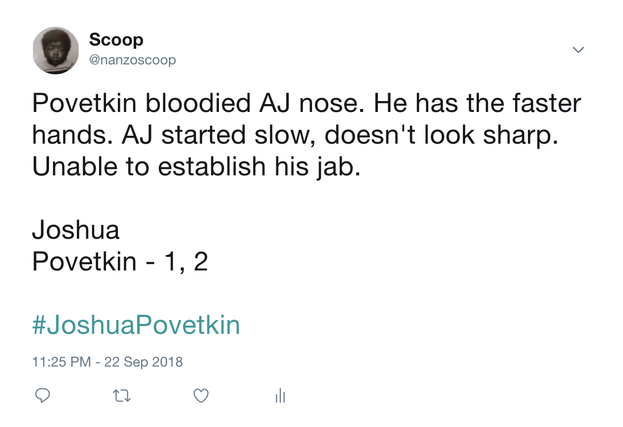 Povetkin bloodied AK nose. He has the faster hands. AJ started slow, doesn't look sharp.unable to establish his jab.