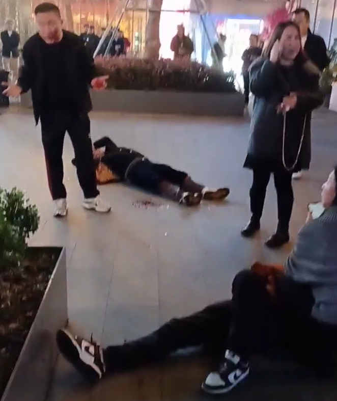 商场外的步行广场上,一场突发冲突打破了午后的平静:一名男子倒在地上,身旁散落着血迹,另一名嘴角带血的男子站在一旁,情绪激动地比划着,周围的市民或惊慌呼喊,或驻足围观,紧张的氛围瞬间笼罩了这片本该休闲的公共区域。