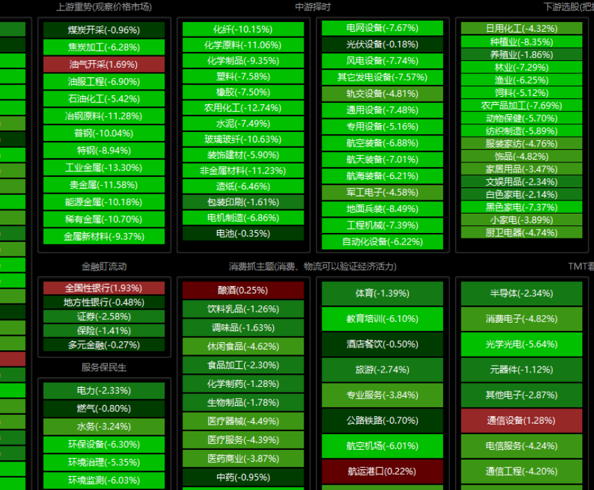 这张板块涨跌幅图清晰展现了市场的极端情绪:绝大多数板块收绿,仅少数板块逆势飘红,呈现出典型的系统性回调特征。