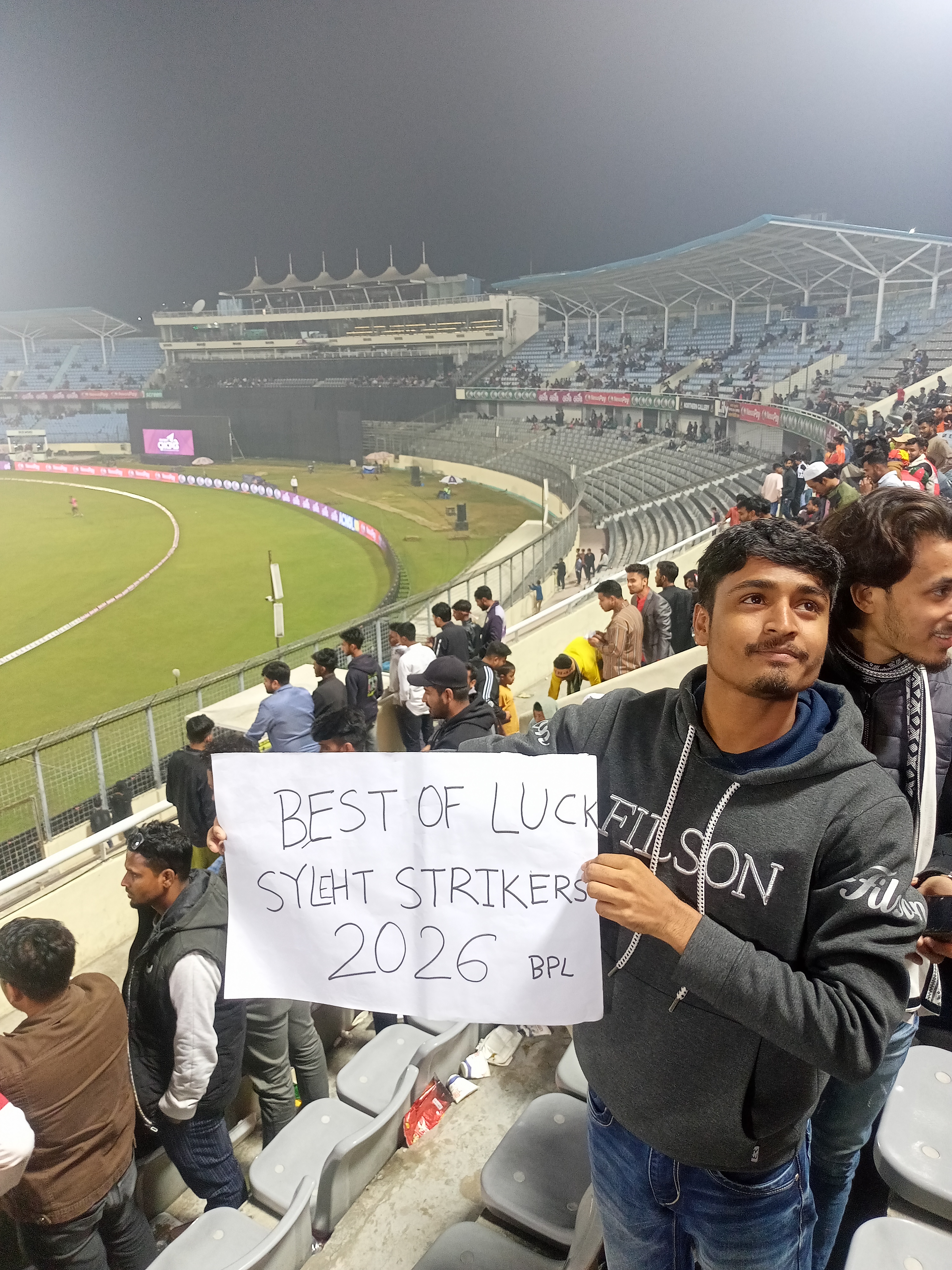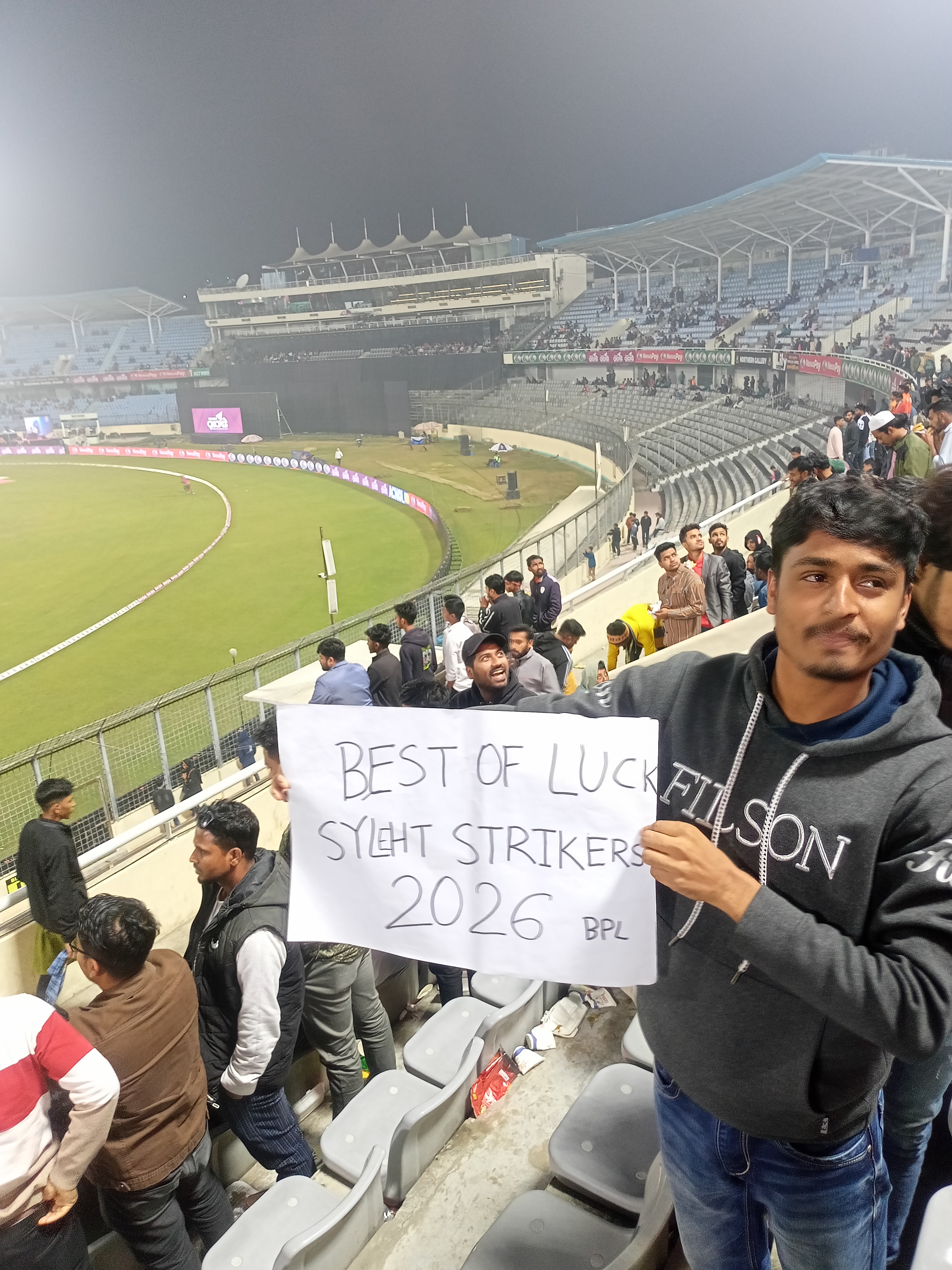 সেই দর্শক প্লেকার্ড হাতে দাঁড়িয়ে সিলেট স্ট্রাইকারের উদ্দেশ্যে বলেন “পরাজয় খেলাধুলার অংশ, কিন্তু আমাদের দল যেভাবে লড়াই করেছে, তাতে আমরা গর্বিত। আগামী বছর আরও শক্তিশালী হয়ে ফিরে আসবে দল, সেই শুভকামনাই রইল।”