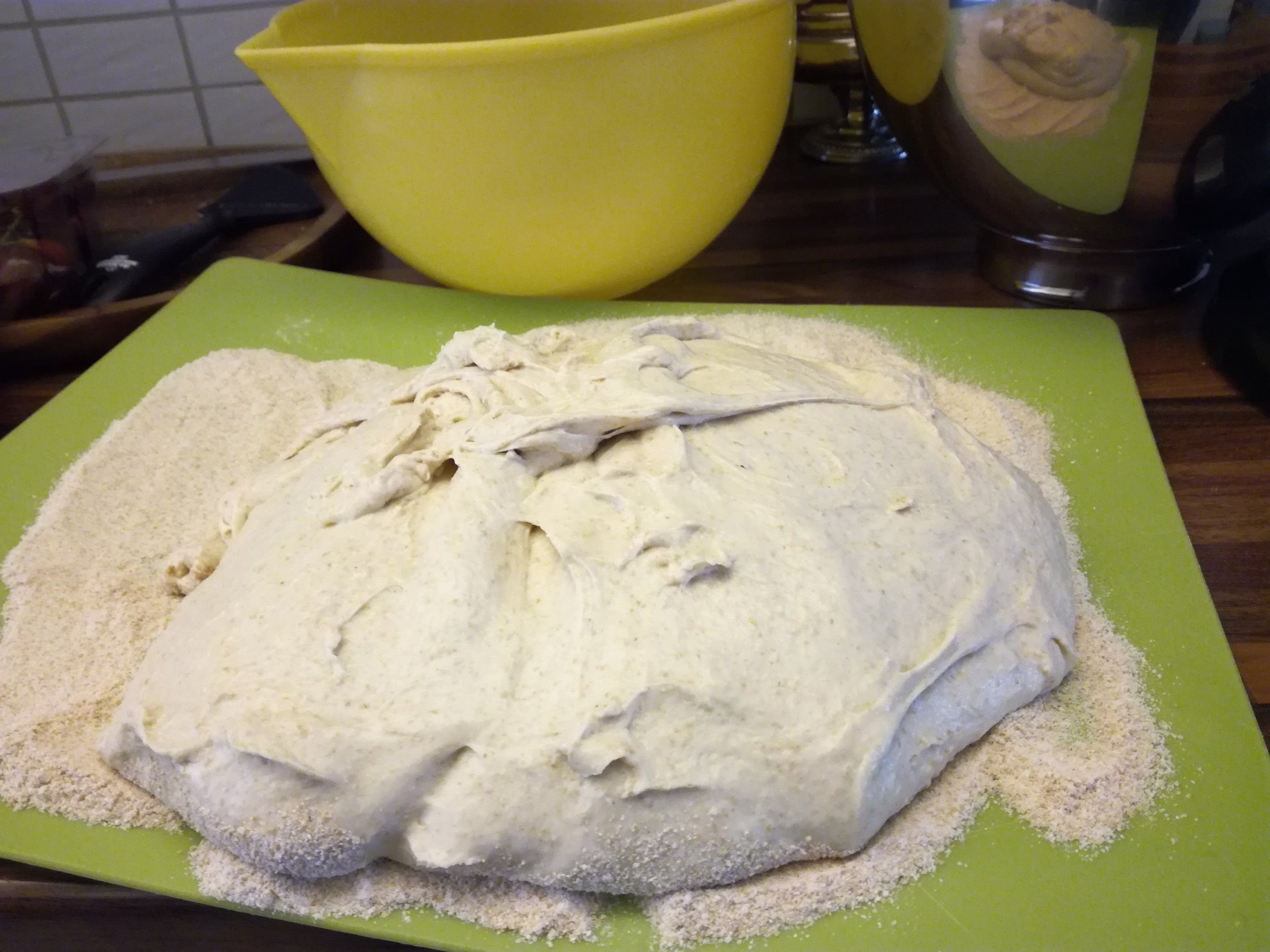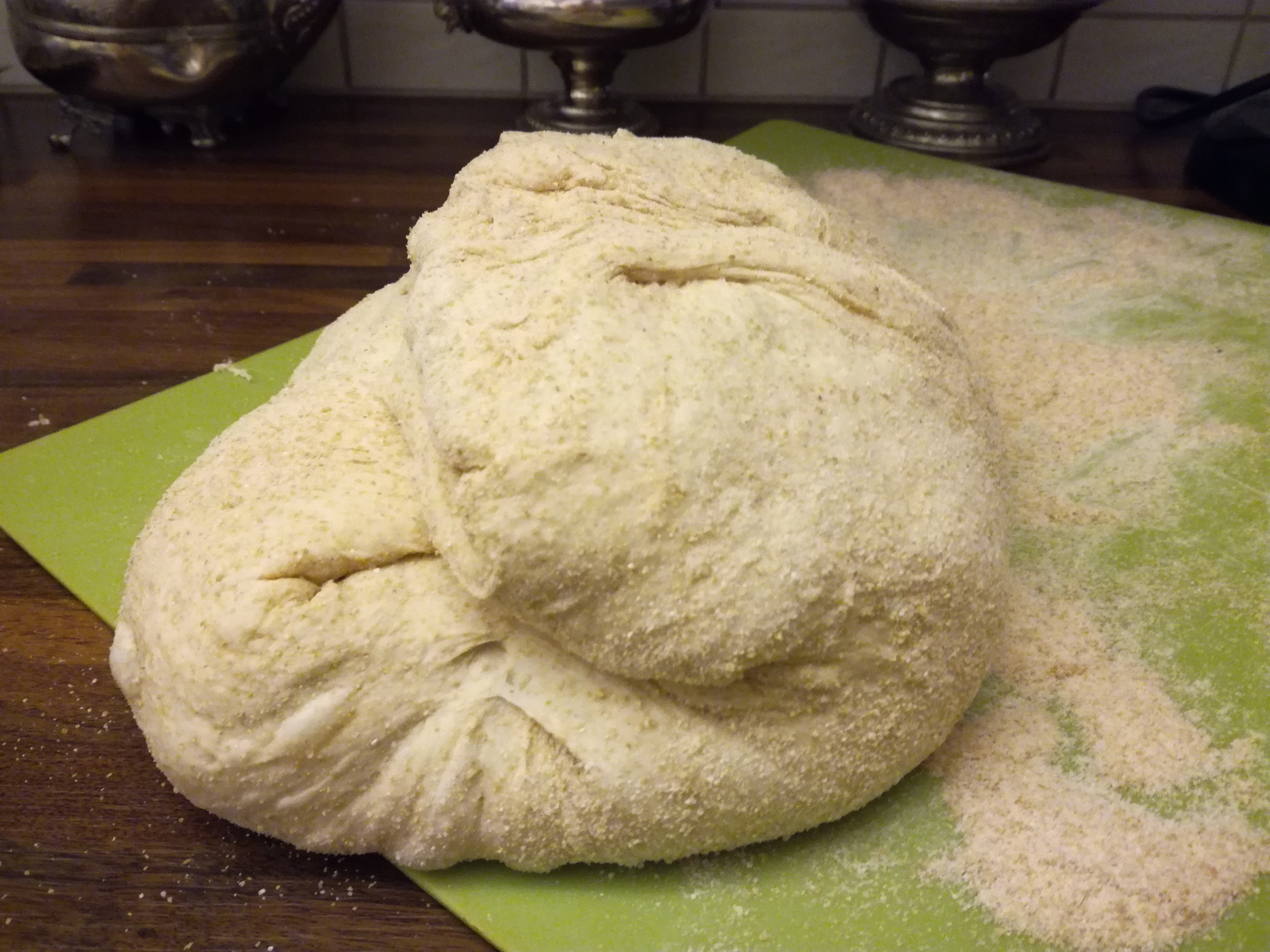 At this point, I'm taking the dough out from the bowl and softly forming it a bit to a nice ball, as I'm going to bake the bread in a pot.