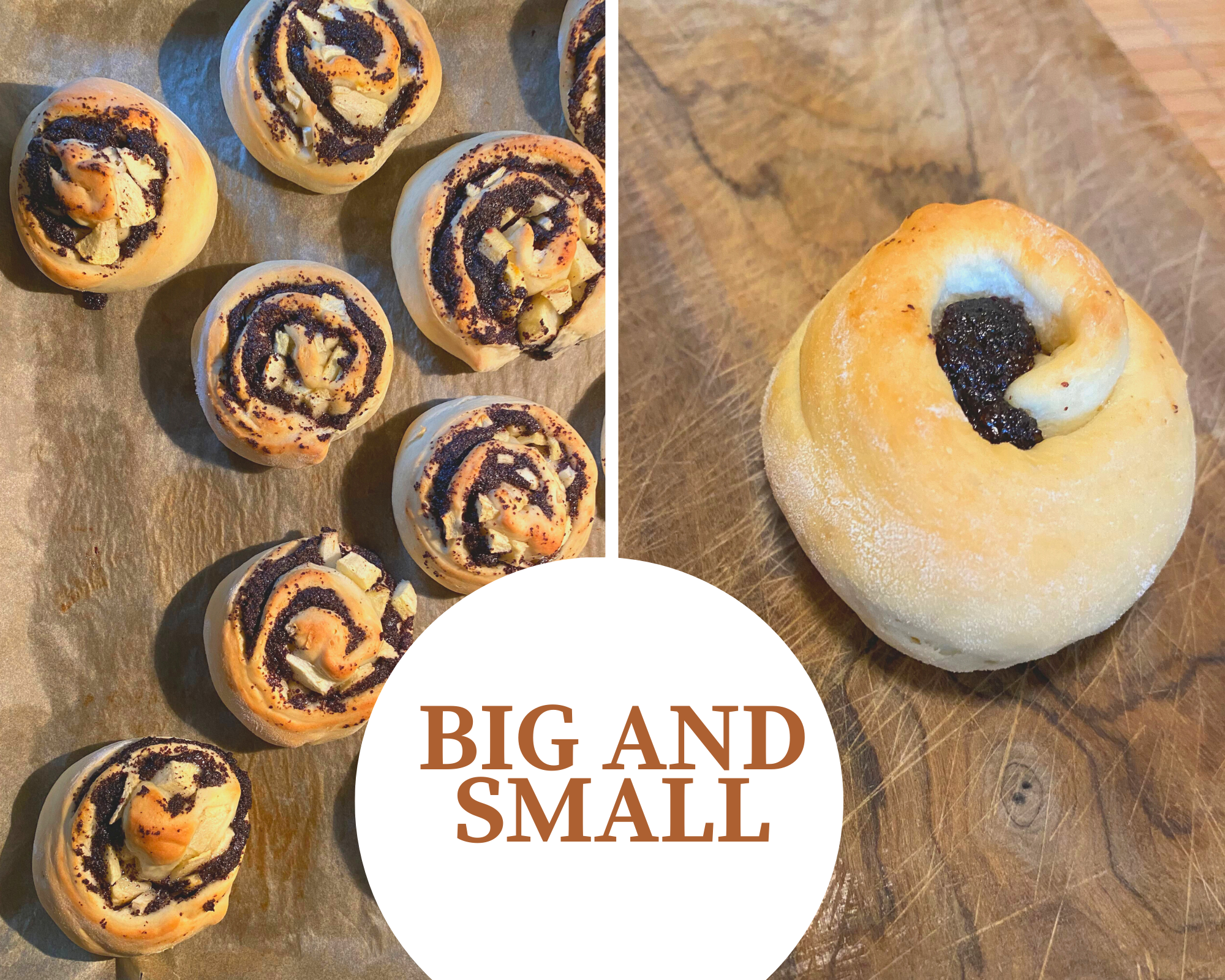 I rolled out the dough into a thin rectangle, creamed it with the poppy seed mixture and sprinkled tiny apple cubes over the poppy seeds. Then I rolled the whole thing into a tight sausage, cut it into pieces, and flattened them with my hand. Again, a bit of rising time and then they went into the oven to turn into something wonderful.