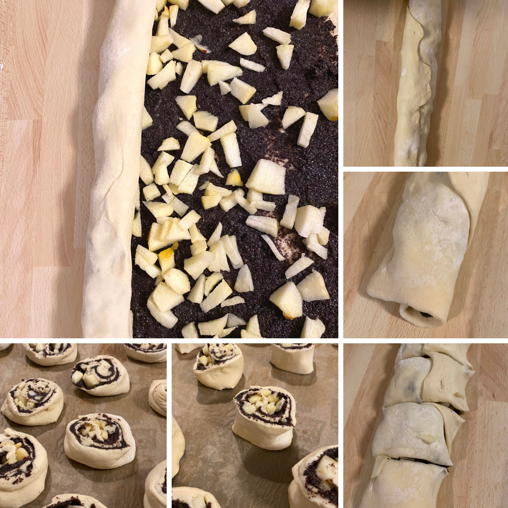 Two days later I finally could give in into my love of sugar and fat (wait… there was no fat involved, but it sounded good): I used the rest of the dough to make poppy seed rolls with apples. I have done it the lazy way with a bough poppy seed mixture for baking which waited to be used.