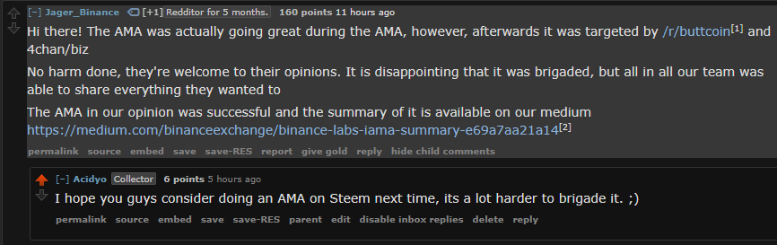 Someone made a post today asking why the AMA went terribly wrong and one of the team members of Binance explained shortly what had happened with the brigading.