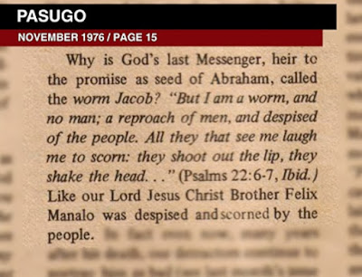 In their Pasugo of November 1976, on Page 15, in a Q-&-A approach, the question asks why their “Last Messenger” is called worm Jacob. The “answer,” according to their indoctrination, is that it is due Manalo’s being despised and scorned.