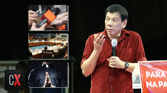 "Mag prangkahan na tayo. It's better to tell the truth and agree on the truth. Rather than play bullshit with journalism. Church, politicians, police, all. There's a veil of hypocrisy. Let us unveil it so we can understand each other and live in a democracy that is run by truth, and not by vested interest of people who pretend. I will not stop. I can spend the whole six years of my presidency exposing you and attacking you... Boycott? Good if you disappear... I don't care if no one covers me... Make this trip your last in Davao." - Rodrigo Duterte, 6/2/2016 at start of a press conference, Malacanan of the South, Panacan, Davao City (http://www.sunstar.com.ph/davao/opinion/2016/06/03/editorial-elephant-room-477511)