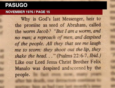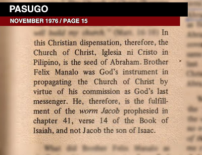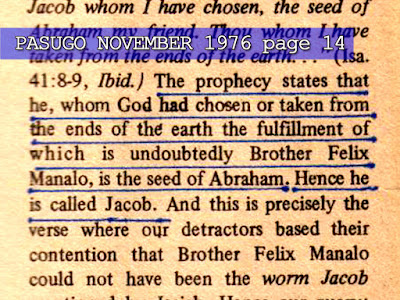 Let us examine the claim that Manalo is the "worm Jacob." In Pasugo of November 1976, on Page 15, it is written that Felix Manalo is God’s Last Messenger. More than that, according to their publication, he is the “worm Jacob” prophesied in Isaiah 41:14. Is he?