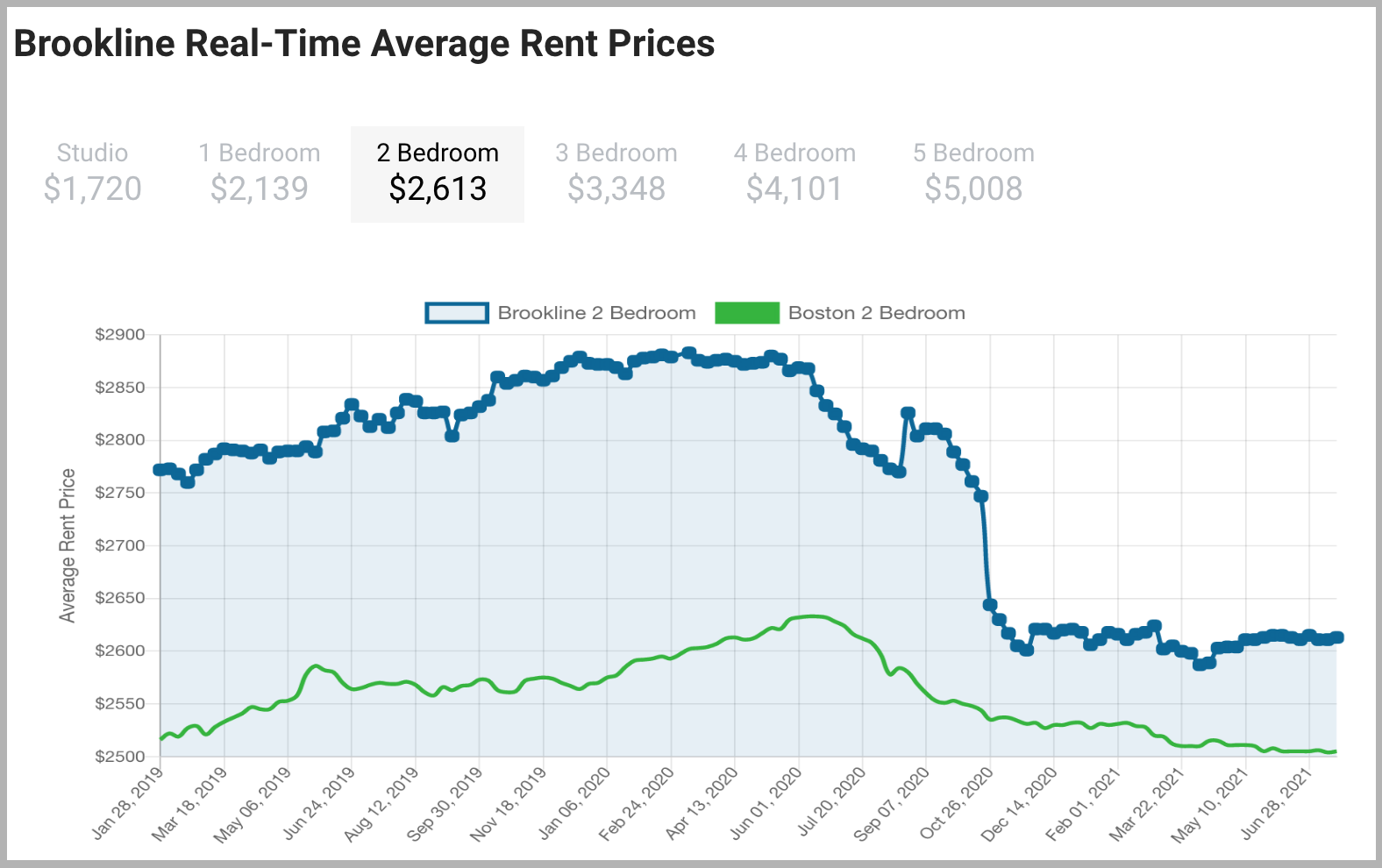 The average rent in Brookline, MA is currently $2,705, which ranks as the second most expensive average rent price behind Cambridge ($2,755). It costs $2,143 to rent a 1 bedroom apartment in Brookline, while a 2 bedroom apartment costs 2,611 on average. Both of these prices rank 2nd highest among all 14 suburbs in Metro Boston. Brookline's average rent of $2,705 is almost 10% higher than the average rent for Boston apartments.