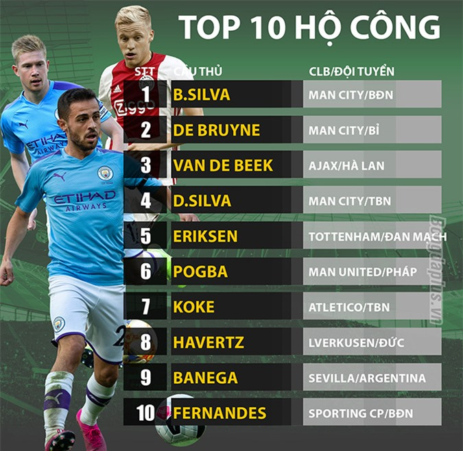 The top 5 are followed by De Bruyne, Van de Beek (Ajax), David Silva and Chris Eriksen. The remaining members from 6th to 10th place are Paul Pogba, Koke (Atletico Madrid), Kai Havertz (Bayer Leverkusen), Ever Banega (Sevilla) and Bruno Fernandes (Sporting Lisbon).