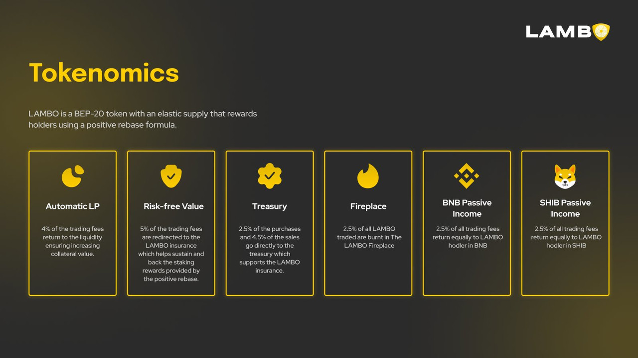 - Insurance 2.5% - 5.5% of all trade fees are stored The Lambo Insurance. Lambo Insurance helps sustain and protect the stakes by ensuring the stability of prices and drastically decreasing the risk of downside.