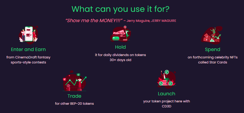 You can also spend your CD3D crypto token to pay for some of the products sold by the merchants on the broader CinemaDraft ecosystem. These services tend to differ, but the point is that you can pay for them using the CD3D token.
