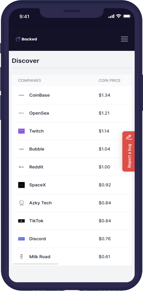 To purchase CompanyCoins of your favorite startups, go to the company profile and click "buy" or the CompanyCoin leader board.