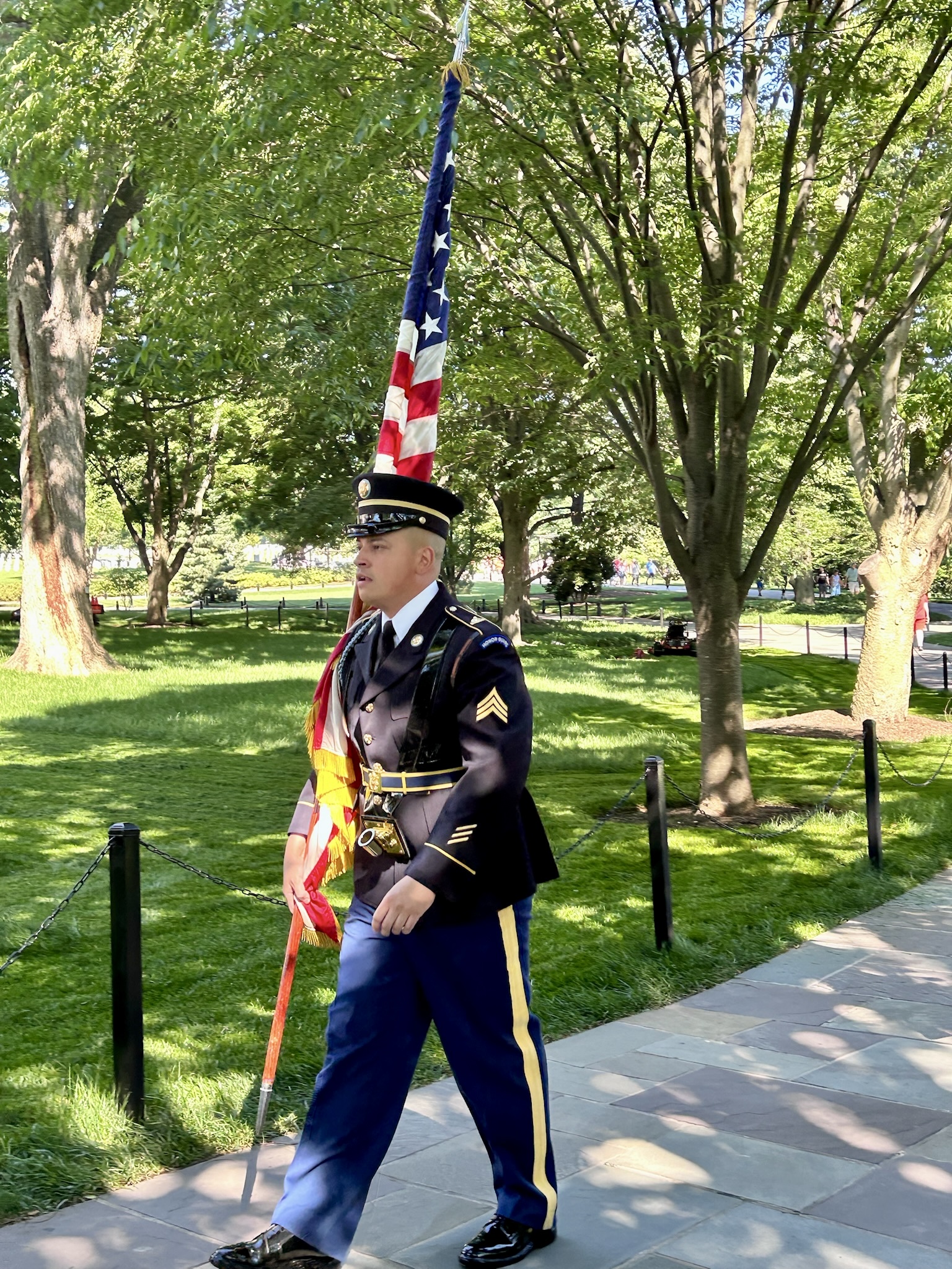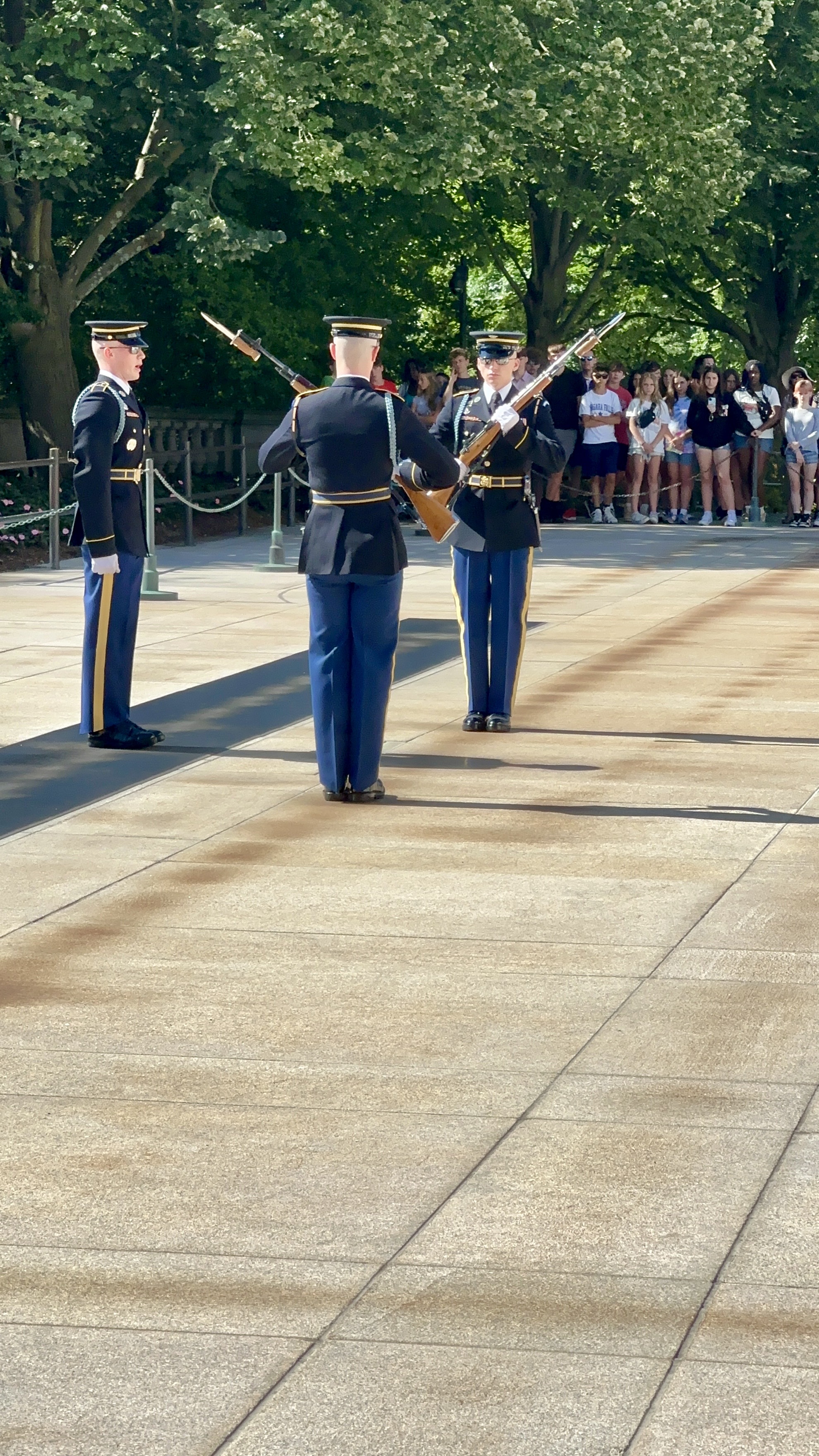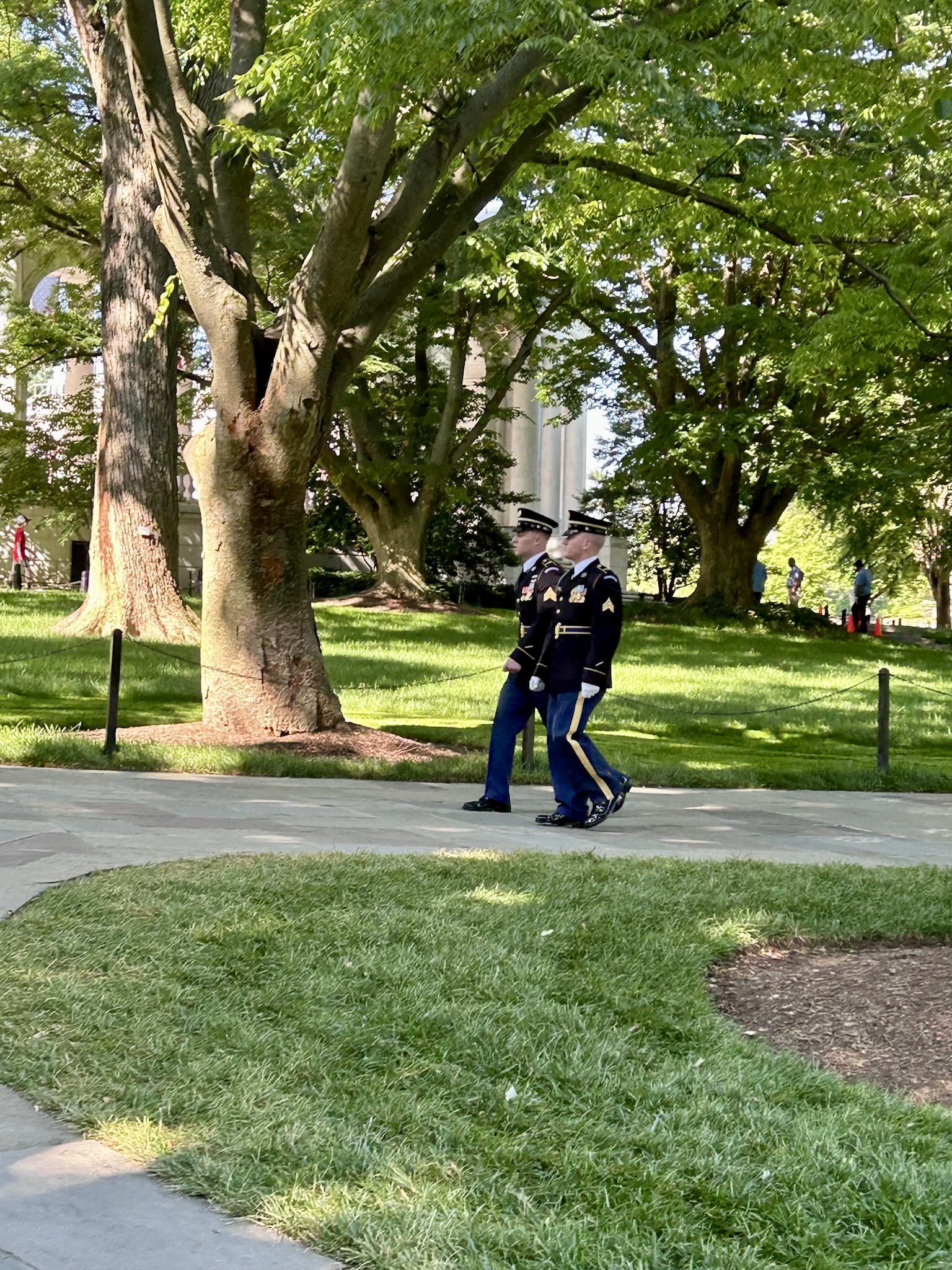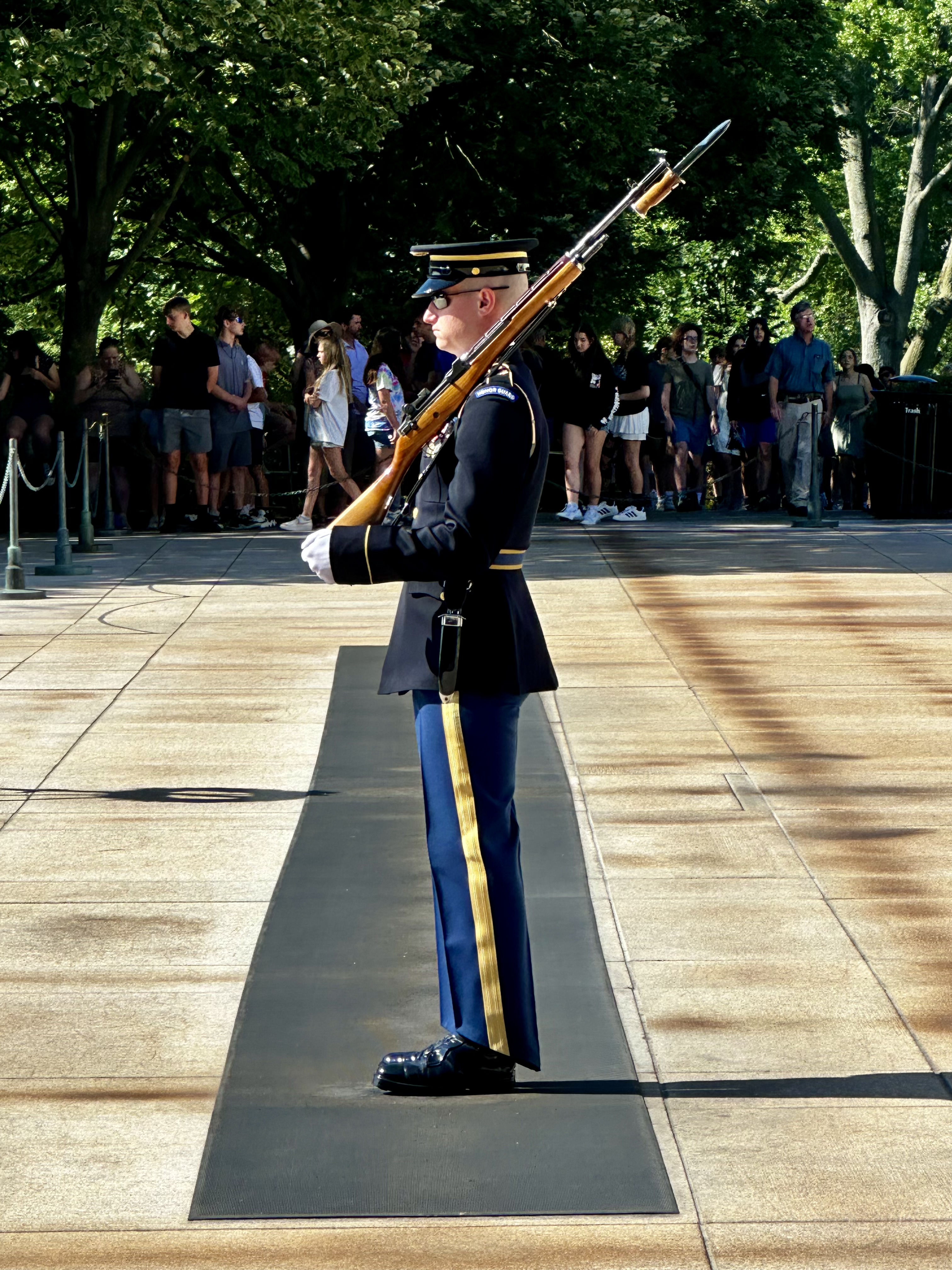 With profound respect and reverence, we observed the Changing of the Guard ceremony at the Tomb of the Unknown Soldier. This solemn tradition has taken place every day, multiple times a day, since 1931. With precise steps and impeccable synchronization, U.S. Army Sentinels relieve one another, ensuring 24/7 vigil over this hallowed ground. The ceremony stands as a powerful expression of gratitude and recognition for all those who have sacrificed their lives for their country.