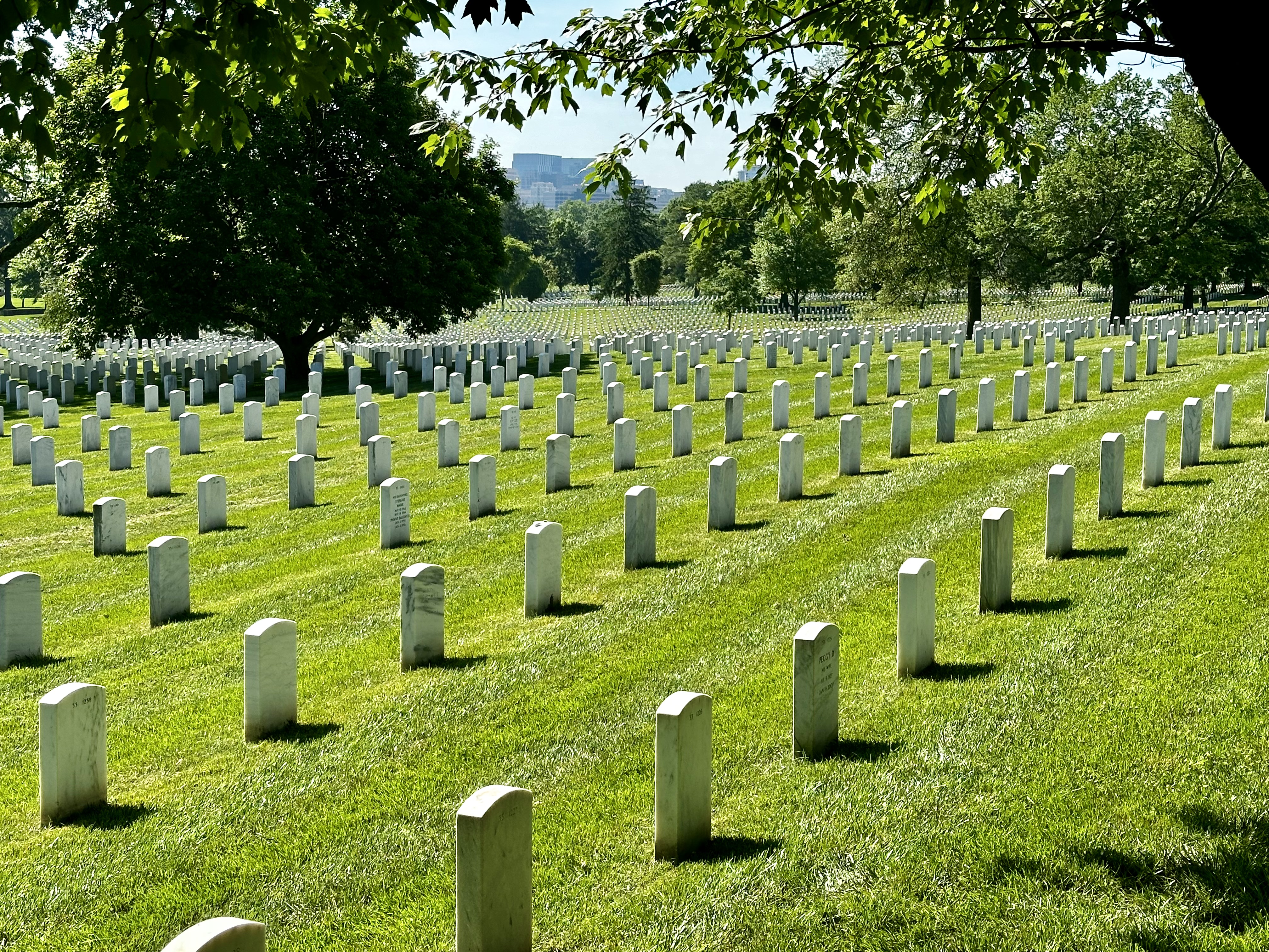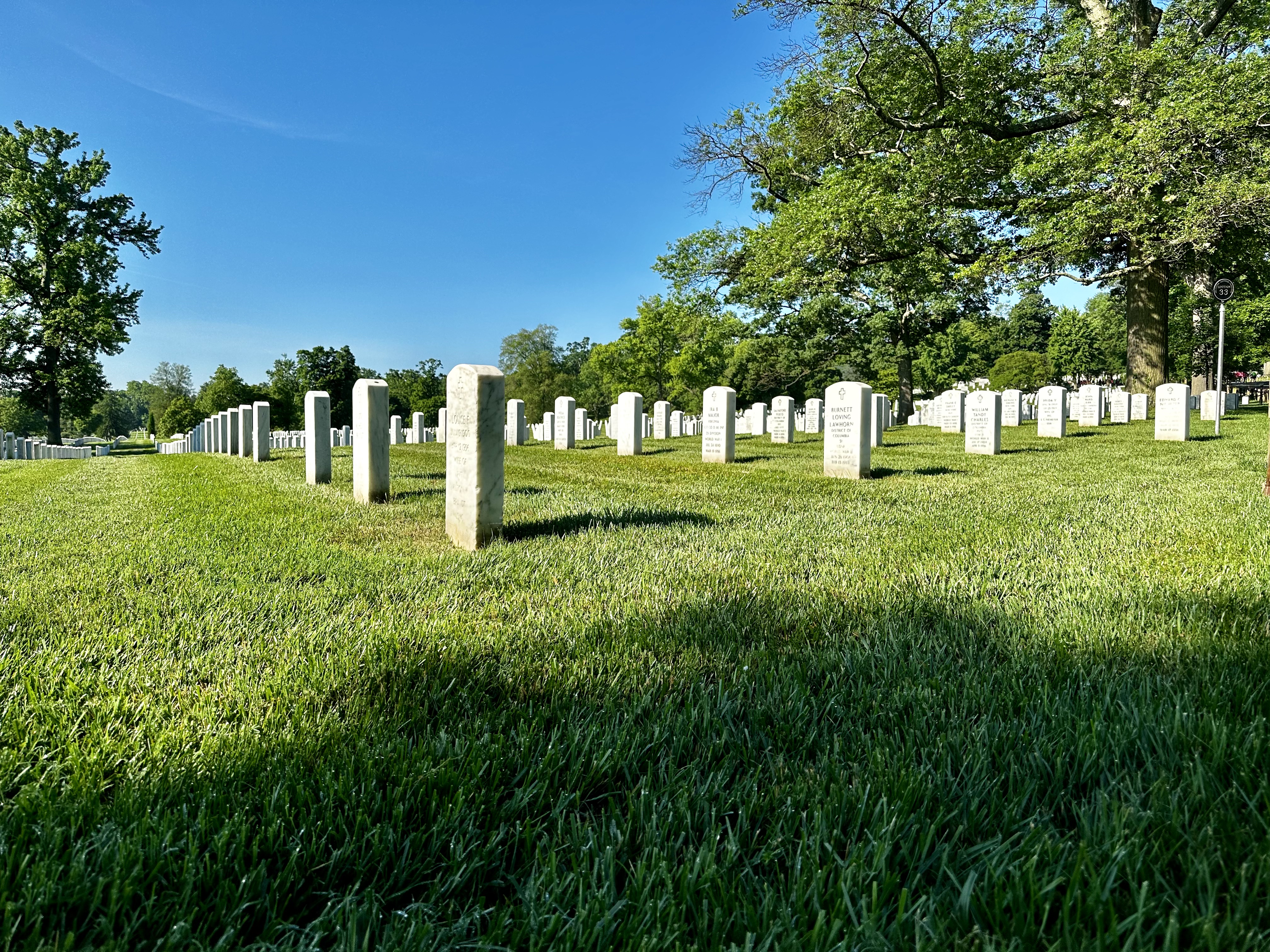 Jenseits der prominenten Gräber erstreckt sich ein Meer aus weißem Marmor, soweit das Auge reicht. Reihen um Reihen von Grabsteinen, jeder mit einem Namen, Rang, einem Datum und einer Geschichte versehen, erzählen von den unzähligen Opfern, die im Laufe der amerikanischen Geschichte gefallen sind. Die schiere Größe und Uniformität dieser Grabsteine sind überwältigend und erinnern uns daran, dass hinter jedem Namen ein Leben, eine Familie und eine Geschichte steht. An vielen Grabsteinen wehen Fähnchen im Wind oder es lehnen Bilder daran von der Person, die hier begraben ist.