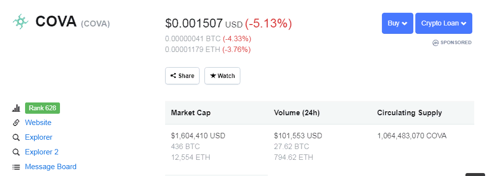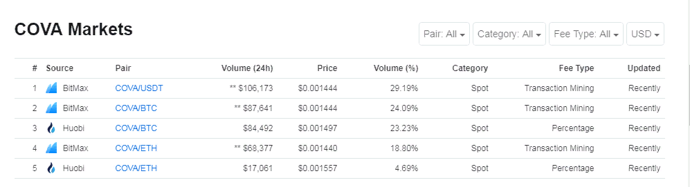 market can be found here https://coinmarketcap.com/currencies/cova/#markets