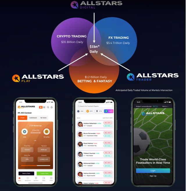 AllStars Digital has alot of potential as explained above. The obvious advantage is that It is the maiden sport company that has come up with the innovative idea of building the globe’s first digital sports exchange embedded in performance trading assets. Below is a comparison of the three major and popular financial industries and their daily volume. You can see where the Betting and Fantasy resides among the trio. It is a $1.2 Billion Daily trade volume genre. It is huge yet the smallest among the trio, the Betting and Fantasy industry has alot of potential and would be a force to be reckoned with in the nearest future.