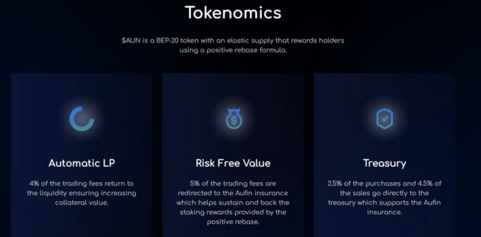 The Aufin Insurance uses an algorithm that backs the Rebase Rewards and is supported by a portion of the buy and sell trading fees that accrue in the Insurance wallet.