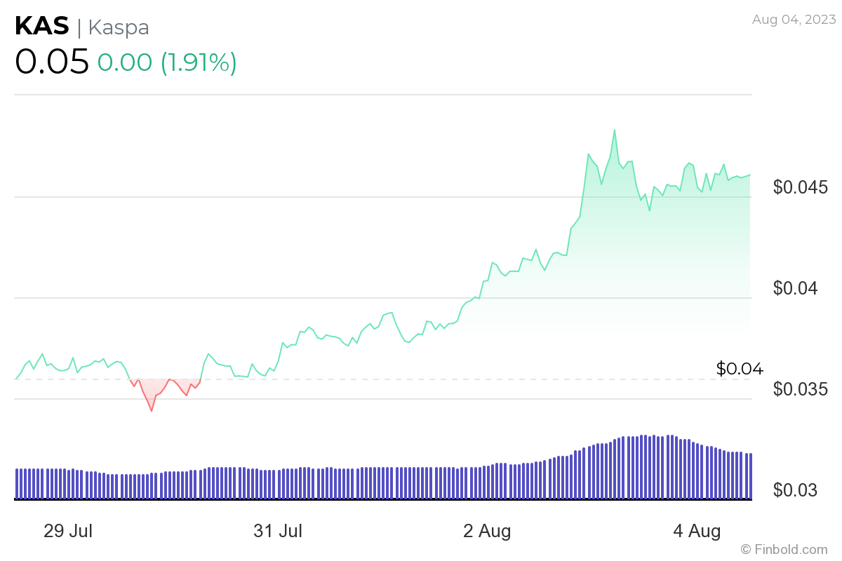 As it happens, Kaspa has been recording consistent gains across all of its charts, including the year-to-date (YTD), on which it has advanced a whopping 783.27%. Presently, its price stands at $0.04591, which represents a 1.91% increase in the last 24 hours, a 27.76% advance across the past seven days, and a 100.81% gain in the last month.