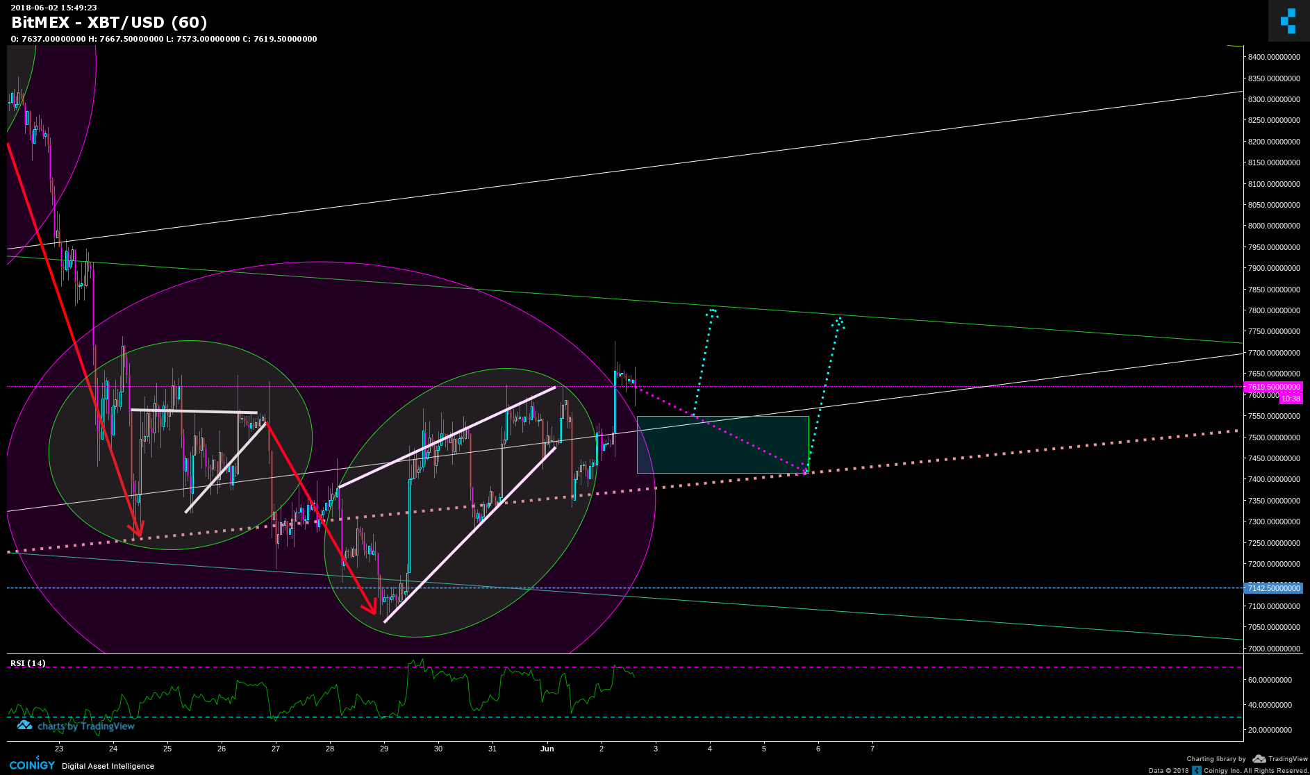 One very strong indicator I use crossed signaling a buy on BTC last night. Another very profitable indicator is nearing a buy call. While BTC looks bullish, we know by now that another "Bart" pattern is likely to finish in the green buy zone. I am scattering buys from $7550 down to $7400. Targeting $7800 as a partial take profit zone. Will keep any longs open until signaled otherwise though.
