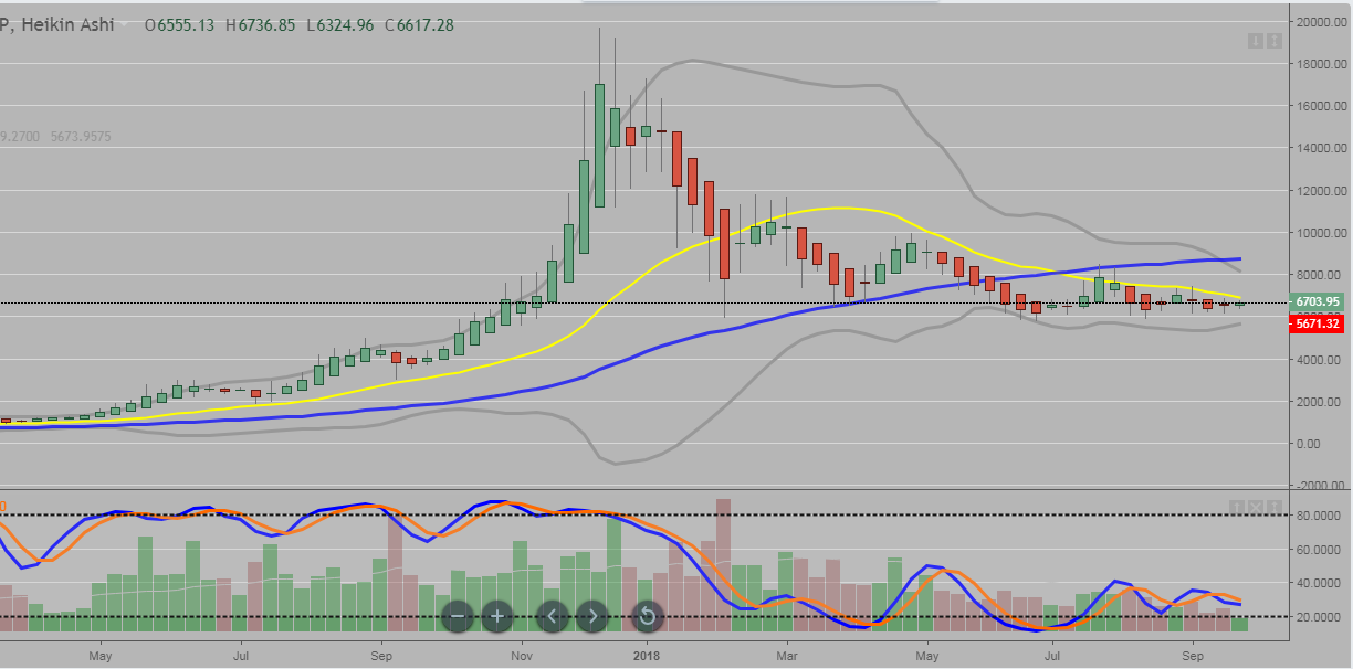 The monthly chart from Bitstamp depicts the downtrend with the red heikin ashi bars since the start of 2018.