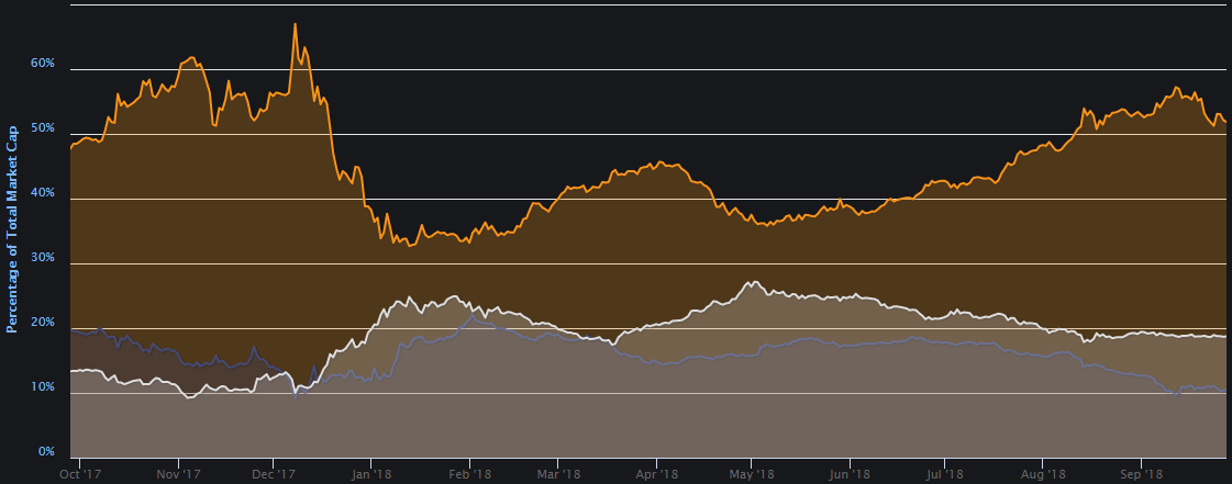 This is the 1 year marketcap chart from coinmarketcap with btc in orange and all of the alt coins in silver.
