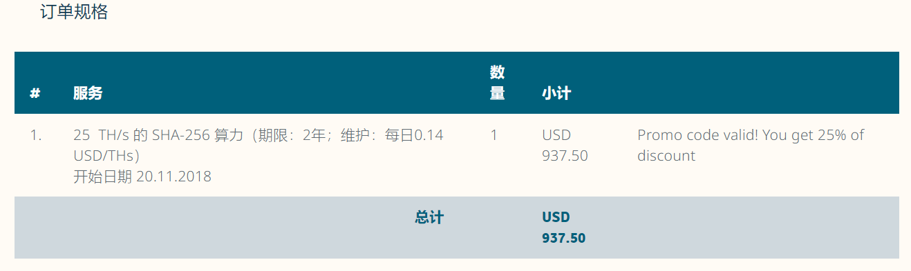 這幾天有黑色星期五的全面七五折促銷活動,只要你在購買時使用 BlackFriday25 做為促銷碼,兩年期的 SHA-256 合約每 TH/s 只要 37.5 美元。你看下圖是我用促銷碼買 25 TH/s 只要 937.5 美元,比買新款的螞蟻礦機 S15 還便宜好多,如果我在這篇「比特大陸 (BITMAIN) 新推出的螞蟻礦機 S15 能買嗎?」裡提到的「礦機兩年壽命論」你也認同的話,那買 S15 還不如現在來買 Genesis。當然,我不是在慫恿你要買,我自己也不會去買,因為其實你如果精算一下未來收益的話,還不如利用現在幣價這麼低,直接買幣比較實際。我只是想突顯出 S15 售價太貴的事實。