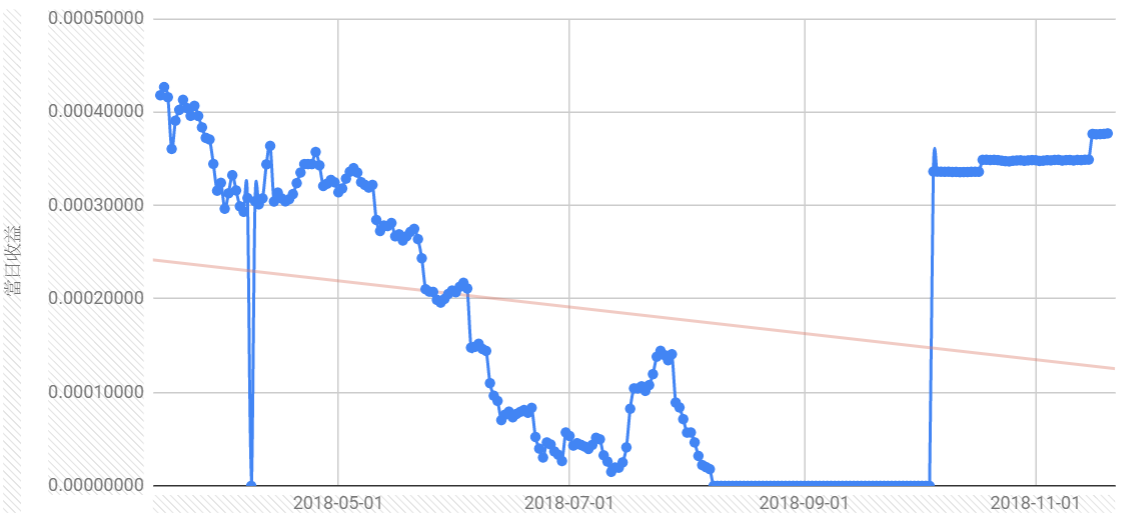 下圖的期末報酬率預估趨勢圖現在變得很有趣,紅線代表的法幣報酬率因為比特幣大跌到只剩四千鎂出頭而下彎,但是藍線代表的加密貨幣觀點卻是受惠於幣價大跌導致的全網算力驟降,每日得礦逐步攀高,報酬率自然谷底翻揚。