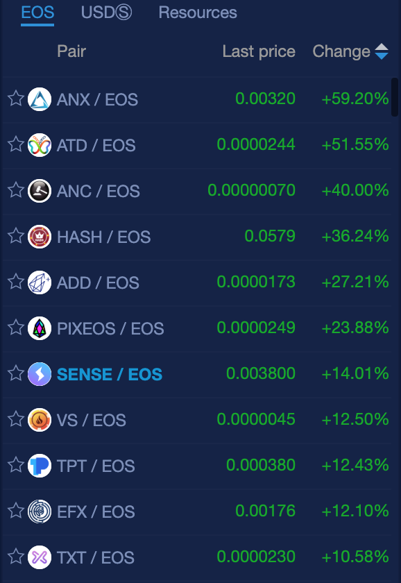 EOS projects on NewDex.io have double digit gains by: ANX (59%), ATD (51%), ANC (40%), HASH (36%), ADD (27%), PIXEOS (23%), SENSE (14%), VS (12%), TPT (12%), EFX (12%) and TXT (10%).