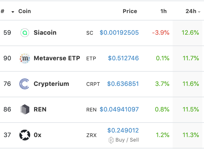In the top 100 market cap on coingecko.com we have Double digit gains by: SC (12%), ETP (11%), CRPT (11%), REN (11%) and ZRK (11%).