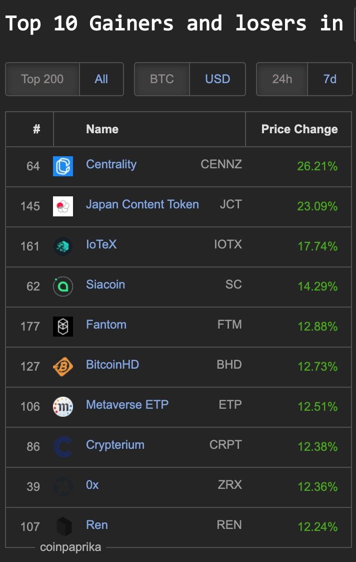 In the top 200 market cap with Double digit % gains on Coinpaprika.com we have: CENNZ (26%), JCT (23%), IOTX (17%), SC (14%), FTM (12%), BHD (12%), ETP (12%), CRPT (12%), ZRX (12%) and REN (12%).