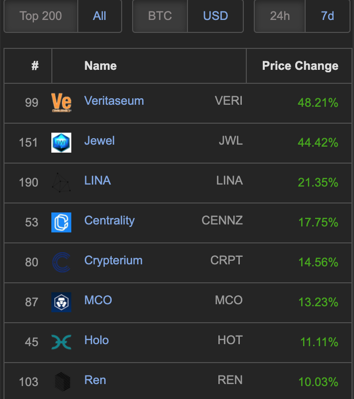 In the top 200 market cap with Double digit % gains on Coinpaprika.com we have: VERI (48%), JWL (44%), LINA (21%), CENNZ (17%), MCO (13%), HOT (11%), REN (10%)