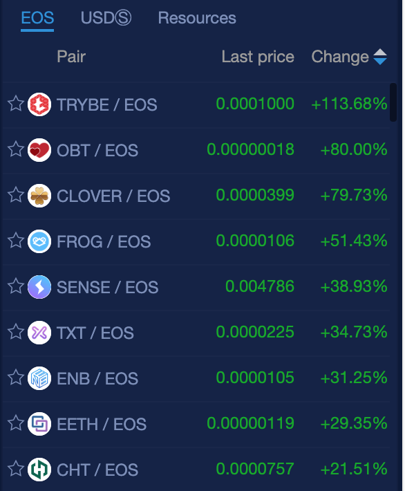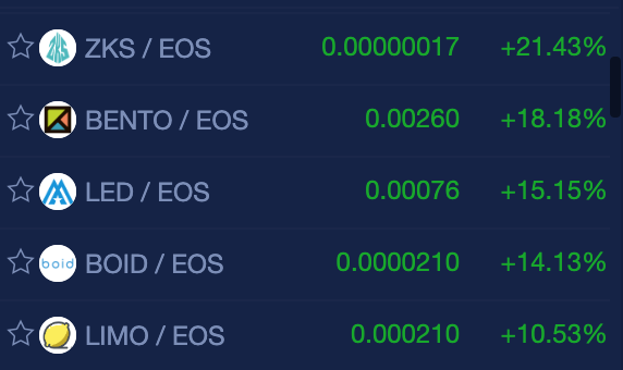 EOS projects on NewDex.io have triple digit gains by TRYBE (113%) & double digit gains by: OBT (80%), CLOVER (79%), FROG (51%), SENSE (38%), TXT (34%), ENB (31%), EETH (29%), CHT (21%), ZKS (21%), BENTO (18%), LED (15%), BOID (14%) and LIMO (10%).