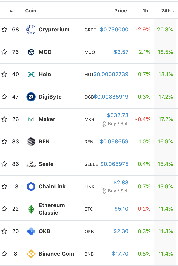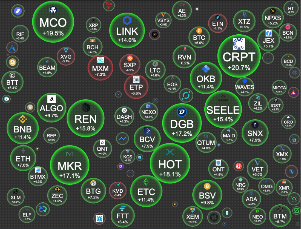 In the top 100 market cap on coingecko.com we have Double digit gains by: CRPT (20%), NCO (18%), HOT (18%), DGB (17%), MKR (17%), REN (16%), SEELE (15%), LINK 13%, ETC (11%), OKB (11%) and BNB (11%).