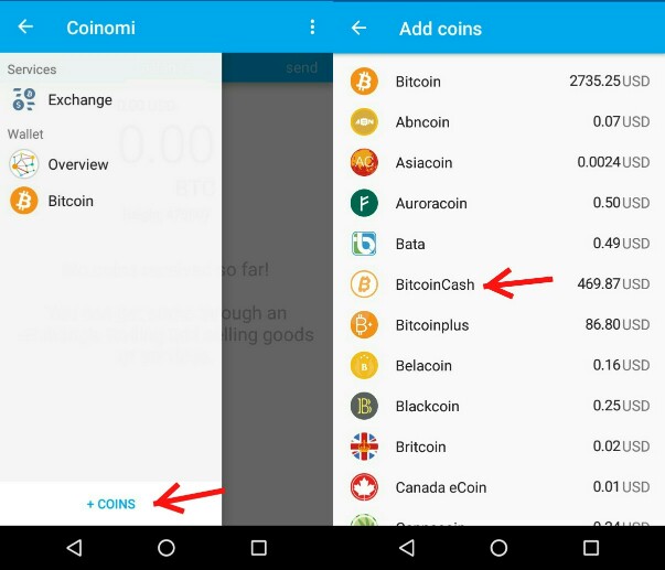 - Click on the top left menu, then click on + COINS and select BitcoinCash.