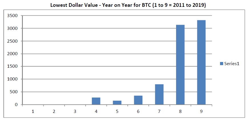 If the lowest value of BTC of each year is taken and put into a graph, then the effect of this massive 275% on average growth can be seen. This 275% has been calculated on the basis of 2019 being at $3316.44 per BTC. Compared to the previous Bear market we saw in 2015, this is amazing because even through the Bear Market that started towards end 2017 leading through 2018, BTC did not even break through the previous lows of 2016 or 2017.