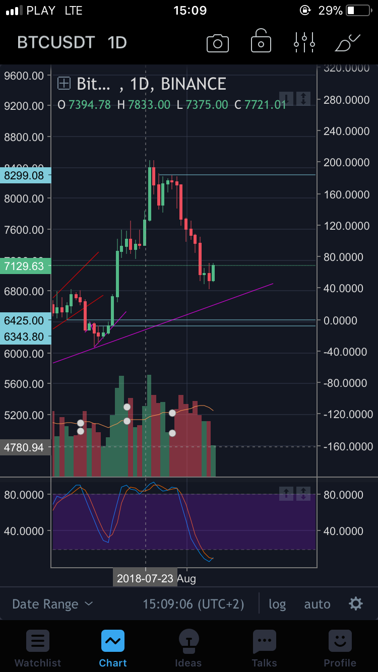 Secondly look at volumen. When the price of BTC go down two and three days ago they were less sellers, that could means that the downward trend is decelerating.