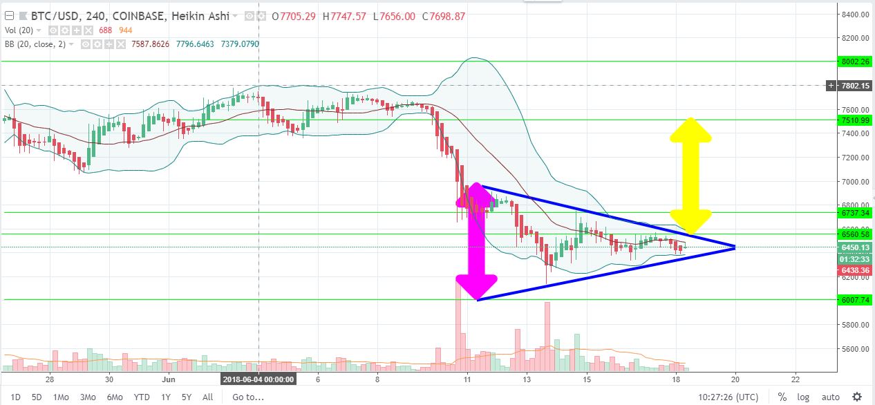 Here I am taking 4 hours chart and as I can see here it is forming triangle pattern and if it’s breakout $6735 then we could see Bitcoin can trading in $7500 to $7800 but if it’s breakdown then we could see Bitcoin can go down to $6030 .All matters is Volume and a massive Good News.