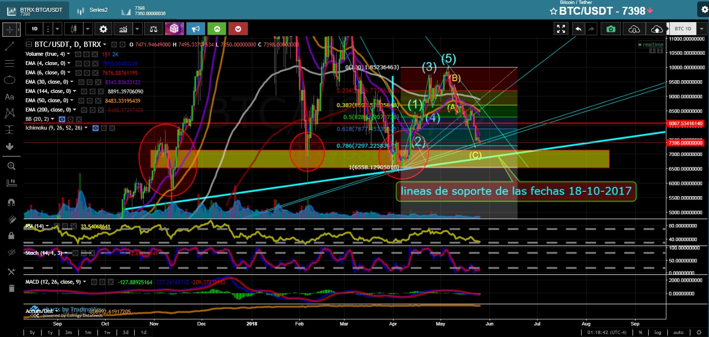 aca en el analisis de 1D primero tenemos a fibonacci a punto de tocar el 0.786 en la cual deberia de darnos una fuerte alza ya lo hizo cuando lo toco con un flashcrash hace 2 dias y regreso rapidamente y quiere volver a intentarlo tambien esta a punto de tocar la linea de tendencia de romperse dicha linea de tendencia tendriamos una baja para la zona que esta en los 7128 a 6680 y tambien hay otra linea de tendencias como soporte de la fecha que se coloca alli a mano derecha pero donde se muestra mas fuerte es en la zona amarilla ya que tenemos mucho soporte tambien y los circulos mostrando de el porque deberia de rebotarlo.
