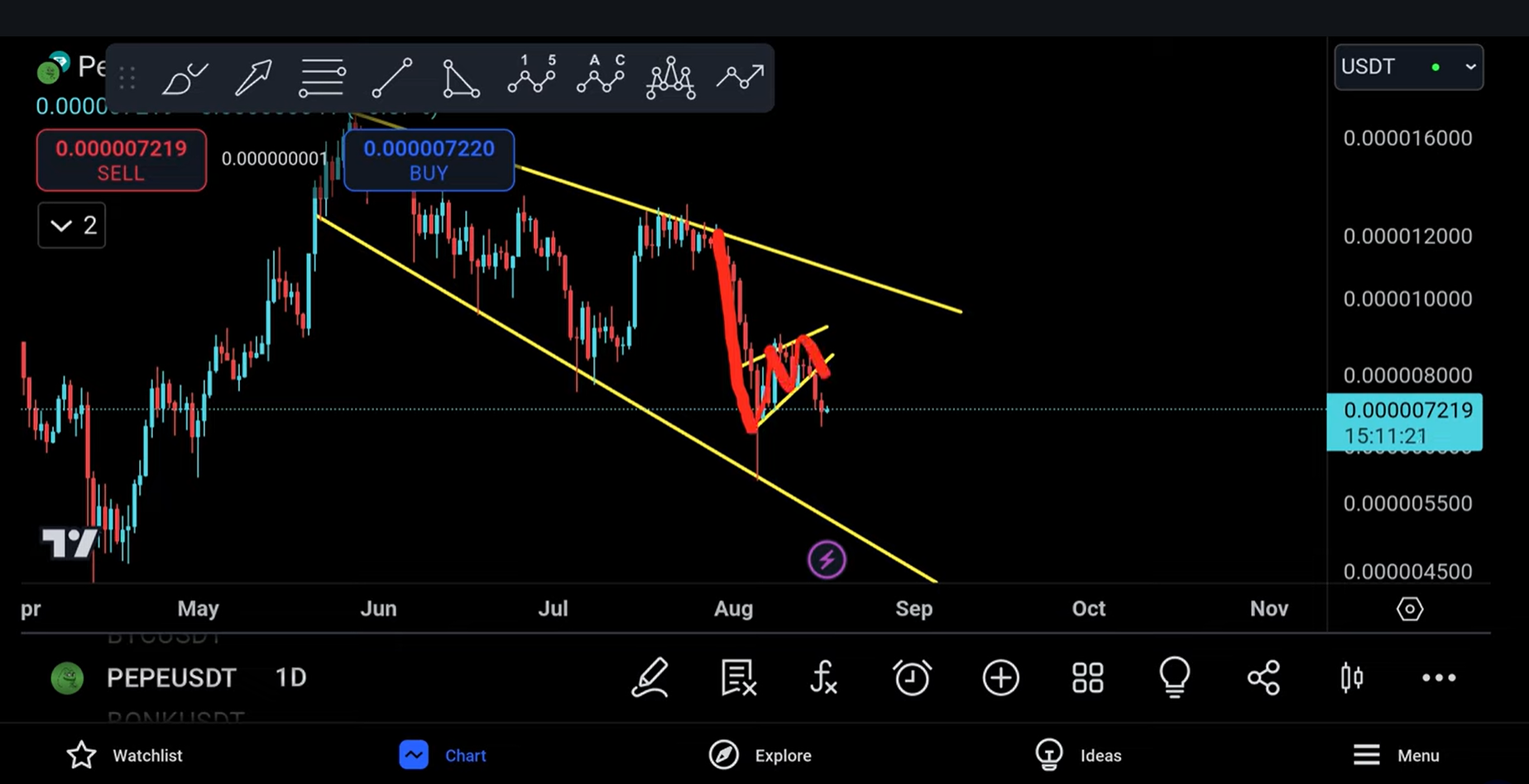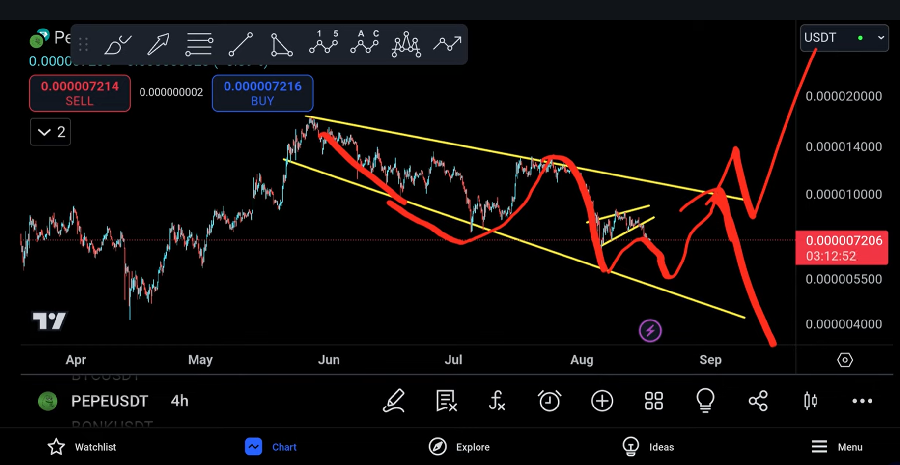 Hi, friends Pepe at the moment At a 4-hour time frame here I have noticed that Pepe is creating one channel and this is the channel that we've seen so far as the start of resistance and then you have your down to support right over there us touch the support move back up go down touch the support and you might end up coming up here maybe go down or break above