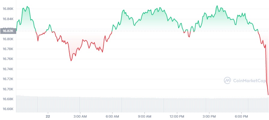 Bitcoin price today is $16,684.08 USD with a 24-hour trading volume of $14,810,066,306 USD. Bitcoin is down 1.19% in the last 24 hours