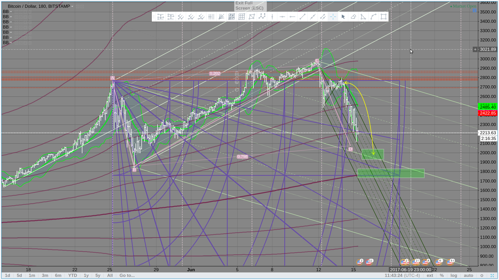 Looks like we're in a bear leg with more strength than the 25may to 27may leg? I have a bunch of followers that pay for my analysis on twitter, 3026 right now. But will do the same at no charge for all steemians. Any questions about any chart? I'll do my best to answer ASAP. Thanks folks. 2000 call from monday BTCUSD.png[Screenshot at 2017-06-15 11:43:24.png](https://steemitimages.com/DQmWug7j8ihXb4FcesCzXGq1oKMQa2Caz4tJjuRvx2Y9Lf4/Screenshot%20at%202017-06-15%20