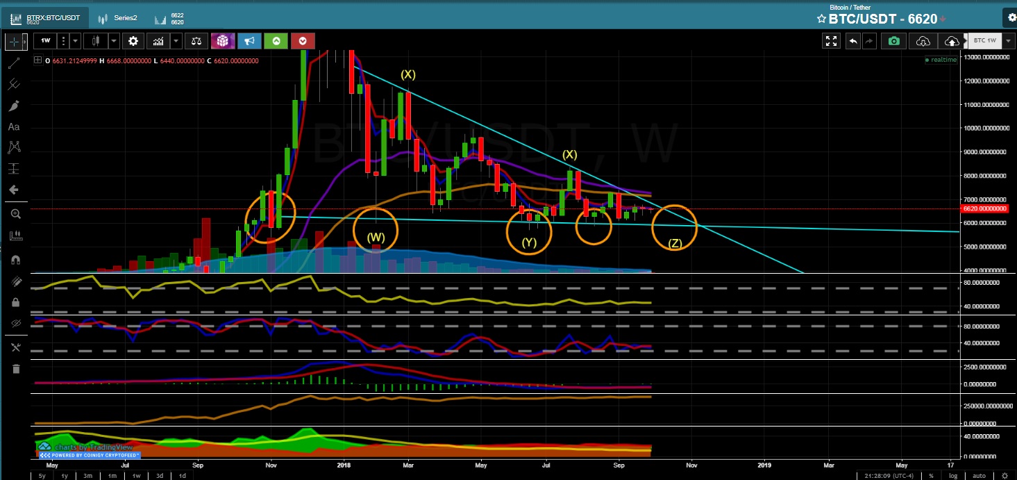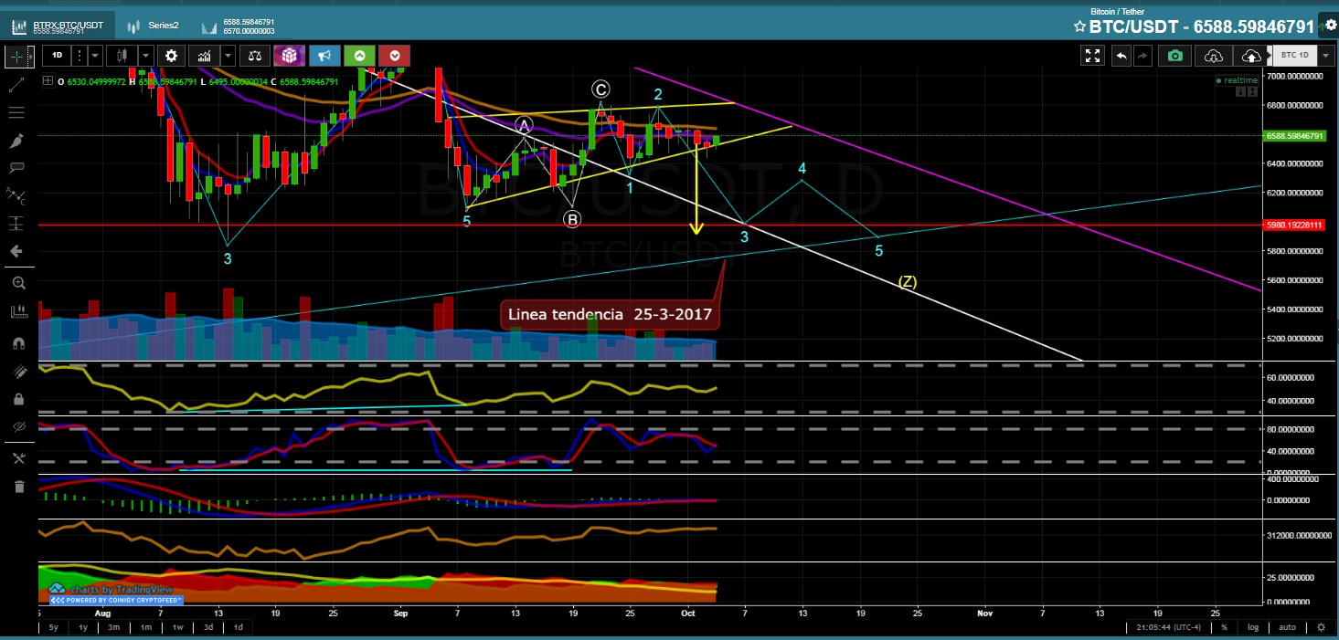 Primero a velas de 1D en bitcoin vemos lo siguiente una posible baja mas al romper el triangulo que tenemos como rising wedge al romper ese triangulo tendriamos una baja hacia los 5895 dolares en la cual esta la linea de tendencia de la fecha 25-3-2017 alli tendremos la prueba de fuego para la posible ruptura y de no romperlo podria pasar lo siguiente que estariamos mostrando unos toques a velas semanales la cual ah mostrado rechazo y rebotado en el precio y esto puede traer devolucion del mercado al alza y tratar de romper el triangulo desde enero a vela semanal la vemos con lo que estoy explicando y por otra parte hay una noticia de bakkt para bitcoin que tiene vinculaciones con la bolsa de new york de comenzar con futuros y esto practicamente es la noticia del año ya que en una noticia explican que comenzaria a finales de este año que tambien coincide con la vela semanal que vemos que practicamente debe tomar una decision noviembre. tambien por otra parte en vela de 1D dentro del triangulo a la baja se ve una figura de un HCH bajista pero por lo general cuando viene de una baja un HCH bajista tiende a ser una beartrap deben estar pendientes sobre eso de momento el mercado anda muy sensible y mucha indecision.