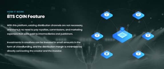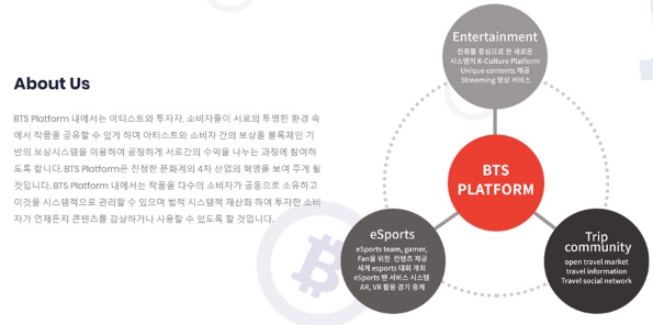 BTSCOIN은 엔터테인먼트 콘텐츠에 코인을 쓰면서도 또 돈을 벌어갈 수 있는 시스템을 구축하고 있는 것으로 알려졌다.